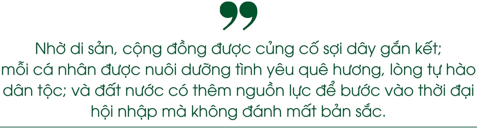 Di sản văn hóa không chỉ là những bằng chứng lịch sử được lưu giữ cẩn trọng trong bảo tàng hay trong những khu di tích. Di sản hiện diện sống động trong đời sống thường nhật, trong lối sinh hoạt, ứng xử, trong tiếng gọi của quê hương, trong lời ru bên nôi và cả trong những giá trị đạo đức, nhân văn mà cha ông vun đắp. Nhờ di sản, cộng đồng được củng cố sợi dây gắn kết; mỗi cá nhân được nuôi dưỡng tình yêu quê hương, lòng tự hào dân tộc; và đất nước có thêm nguồn lực để bước vào thời đại hội nhập mà không đánh mất bản sắc.