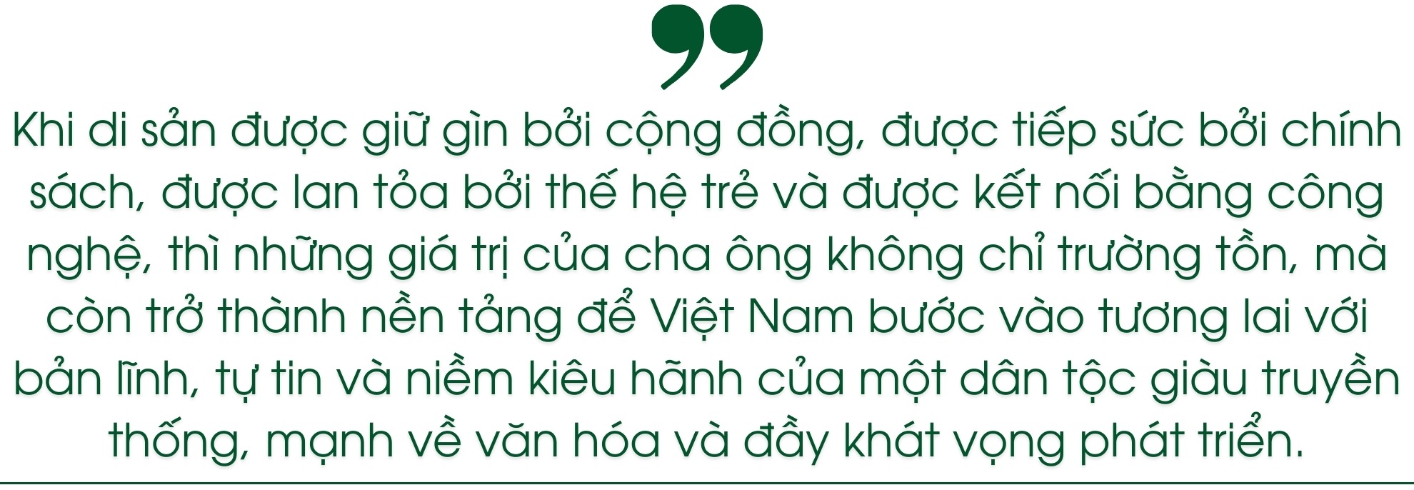 Khi di sản được giữ gìn bởi cộng đồng, được tiếp sức bởi chính sách, được lan tỏa bởi thế hệ trẻ và được kết nối bằng công nghệ, thì những giá trị của cha ông không chỉ trường tồn, mà còn trở thành nền tảng để Việt Nam bước vào tương lai với bản lĩnh, tự tin và niềm kiêu hãnh của một dân tộc giàu truyền thống, mạnh về văn hóa và đầy khát vọng phát triển.