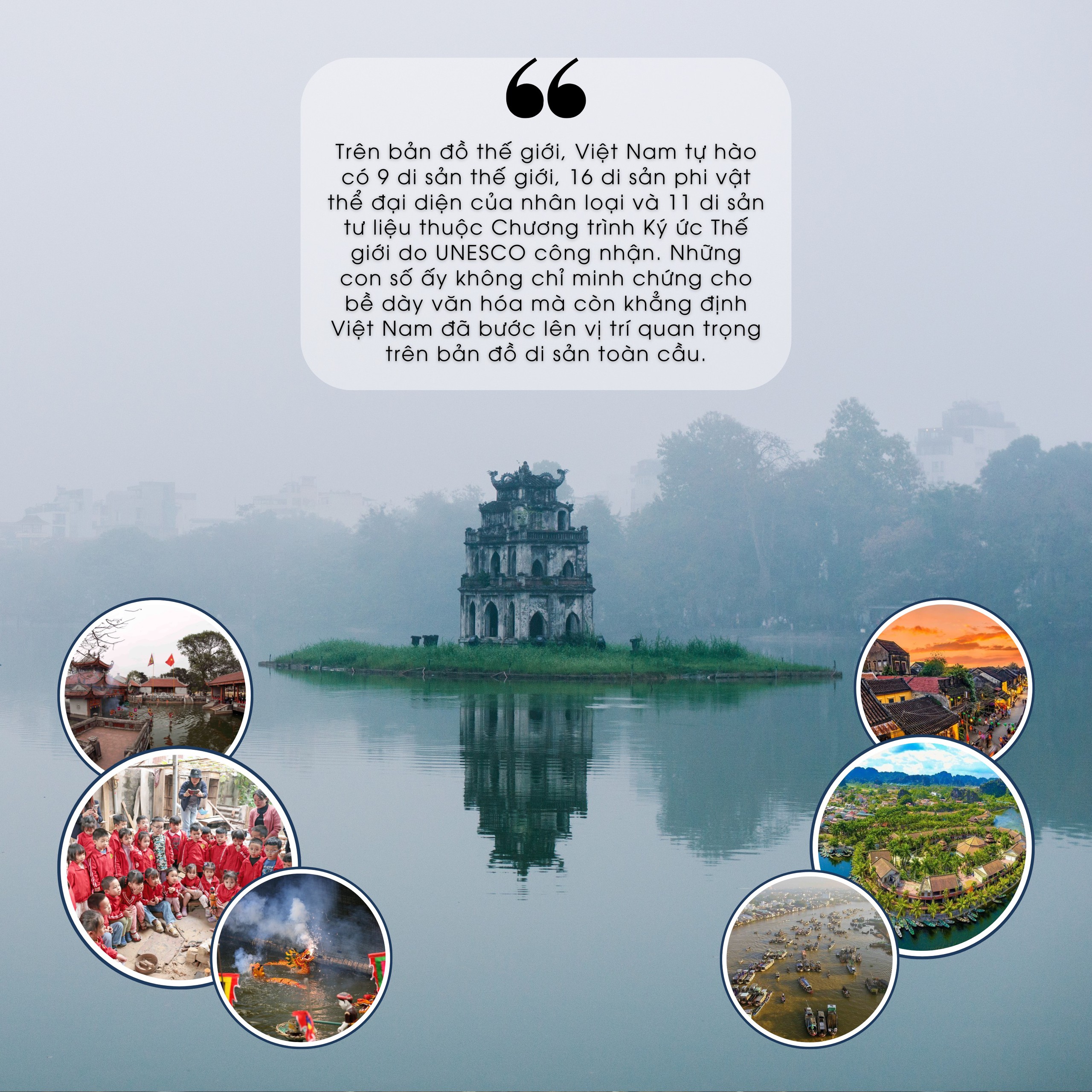 Song song với đó là hơn 7.000 di sản phi vật thể đã được kiểm kê và hơn 500 di sản được đưa vào Danh mục Di sản Văn hóa Phi vật thể quốc gia. Trên bản đồ thế giới, Việt Nam tự hào có 9 di sản thế giới, 16 di sản phi vật thể đại diện của nhân loại và 11 di sản tư liệu thuộc Chương trình Ký ức Thế giới do UNESCO công nhận. Những con số ấy không chỉ minh chứng cho bề dày văn hóa mà còn khẳng định Việt Nam đã bước lên vị trí quan trọng trên bản đồ di sản toàn cầu.
