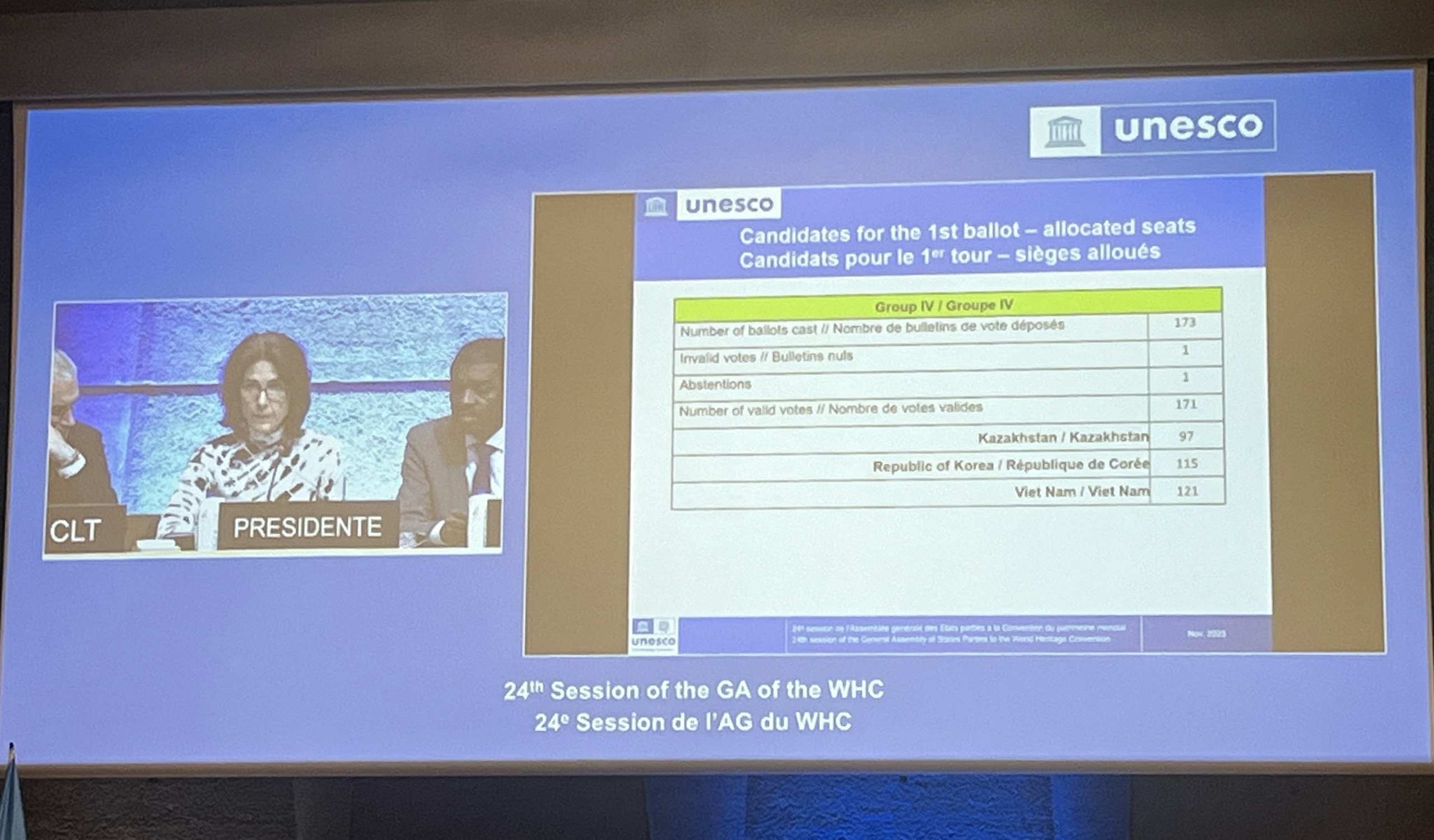 Ngày 22/11/2023 (giờ địa phương), tại trụ sở Tổ chức Giáo dục, Khoa học và Văn hóa Liên Hợp Quốc (UNESCO) ở thủ đô Paris, trong khuôn khổ Kỳ họp Đại hội đồng lần thứ 24 các quốc gia thành viên Công ước Bảo vệ di sản văn hóa và thiên nhiên thế giới (Công ước Di sản Thế giới), Việt Nam đã trúng cử trở thành thành viên của Ủy ban Di sản Thế giới nhiệm kỳ 2023-2027 với 121 phiếu ủng hộ, cao nhất trong nhóm châu Á-Thái Bình Dương