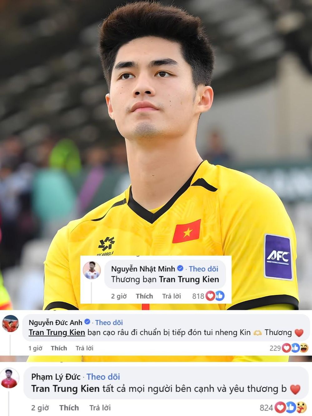 Không chỉ Đình Bắc, nhiều tuyển thủ U23 Việt Nam khác cũng lần lượt bày tỏ sự quan tâm. Nguyễn Nhật Minh ngắn gọn nhưng đầy cảm xúc với lời nhắn "Thương bạn", trong khi Phạm Lý Đức khẳng định cả đội luôn ở bên cạnh và yêu thương thủ môn cao 1m91. Màn tương tác hài hước của Nguyễn Đức Anh càng khiến bầu không khí nhẹ nhàng hơn khi vừa động viên, vừa nhắc khéo Trung Kiên sớm "tút" lại diện mạo quen thuộc.