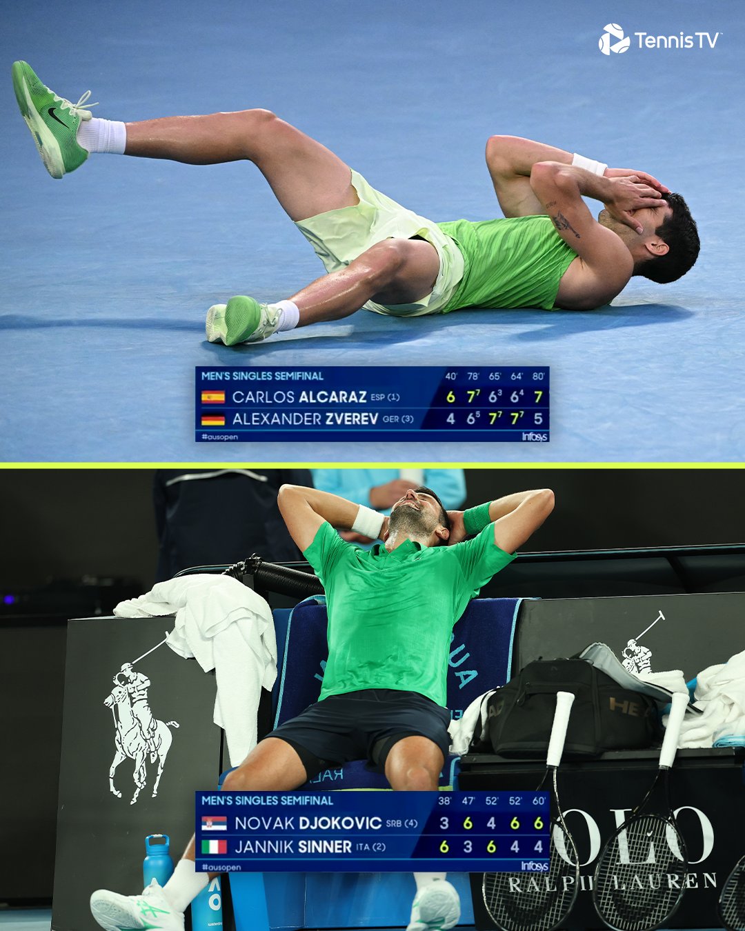 Một trận chung kết độc nhất, như được sắp đặt sẵn, đến từ hai trận bán kết đầy kịch tính. Trước hết, tay vợt số một thế giới Alcaraz đánh bại Alexander Zverev (Đức) sau năm set đấu, dù bị nôn mửa và chuột rút hành hạ. Tỷ số 6-4, 7-6(7-5), 6-7(3-7), 6-7(4-7), 7-5 khép lại trận bán kết dài nhất lịch sử Australian Open: 5 giờ 26 phút.