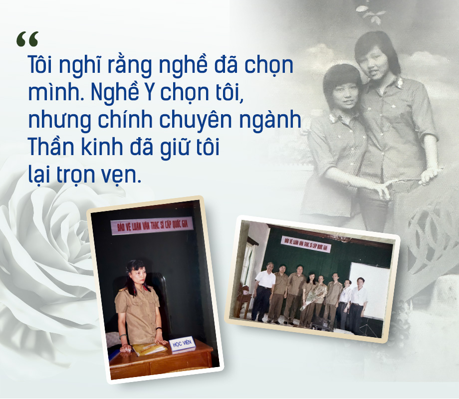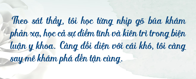 Đó là một sự an bài tuyệt vời. Tôi được làm việc dưới sự dẫn dắt của Giáo sư Phan Chúc Lâm, chuyên gia đầu ngành. Hình ảnh thầy cặm cụi khám bệnh cả tiếng đồng hồ, khám từng tí một để định khu tổn thương trong thời kỳ chưa hề có CT hay Cộng hưởng từ đã in sâu vào tâm trí tôi. Tôi đi theo thầy, học cách thầy gõ búa phản xạ, học tác phong và tính kiên trì biện luận chẩn đoán. Càng khó, tôi lại càng đam mê đào sâu.