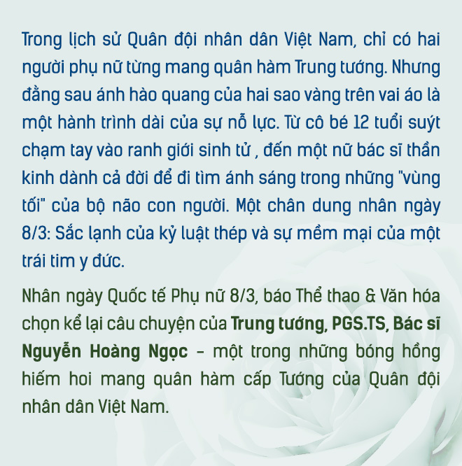 Sắp tới ngày 8/3, nhìn lại chặng đường hơn 40 năm từ khi nhập ngũ, tôi thấy mình vẫn là cô bé 12 tuổi năm nào, luôn nhìn màu áo trắng với tất cả sự ngưỡng mộ và thành kính. Quân hàm Trung tướng là vinh quang, là trách nhiệm nhưng niềm hạnh phúc thực sự nằm ở hành lang bệnh viện, nơi tôi được trực tiếp thăm khám cho nhiều bệnh nhân.