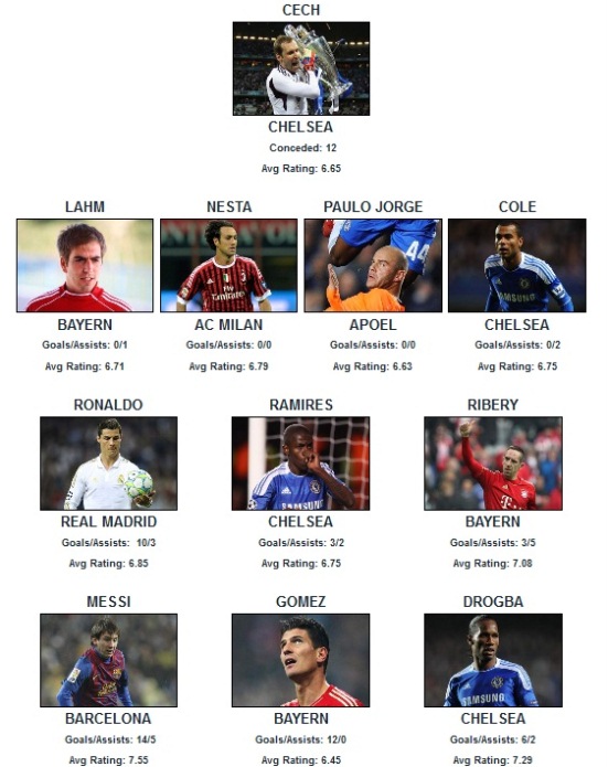 Có thể nói Champions League 2011/12 là mùa giải khó đoán nhất trong lịch sử của giải đấu khi Chelsea, một đội bóng được đánh giá là chiếu dưới, đã vượt qua được những chướng ngại trong chuyến đi tới Munich để xuất sắc hạ gục Bayern và lần đầu tiên đứng lên bục vinh quang của đấu trường châu Âu. Sau trận đấu khép lại mùa giải kịch tính này, tờ Goal đã tiến hành bầu chọn ra đội hình tiêu biểu của Champions League mùa giải 2011/12.