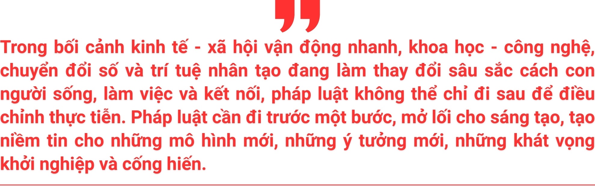 Trong bối cảnh kinh tế - xã hội vận động nhanh, khoa học - công nghệ, chuyển đổi số và trí tuệ nhân tạo đang làm thay đổi sâu sắc cách con người sống, làm việc và kết nối, pháp luật không thể chỉ đi sau để điều chỉnh thực tiễn. Pháp luật cần đi trước một bước, mở lối cho sáng tạo, tạo niềm tin cho những mô hình mới, những ý tưởng mới, những khát vọng khởi nghiệp và cống hiến.