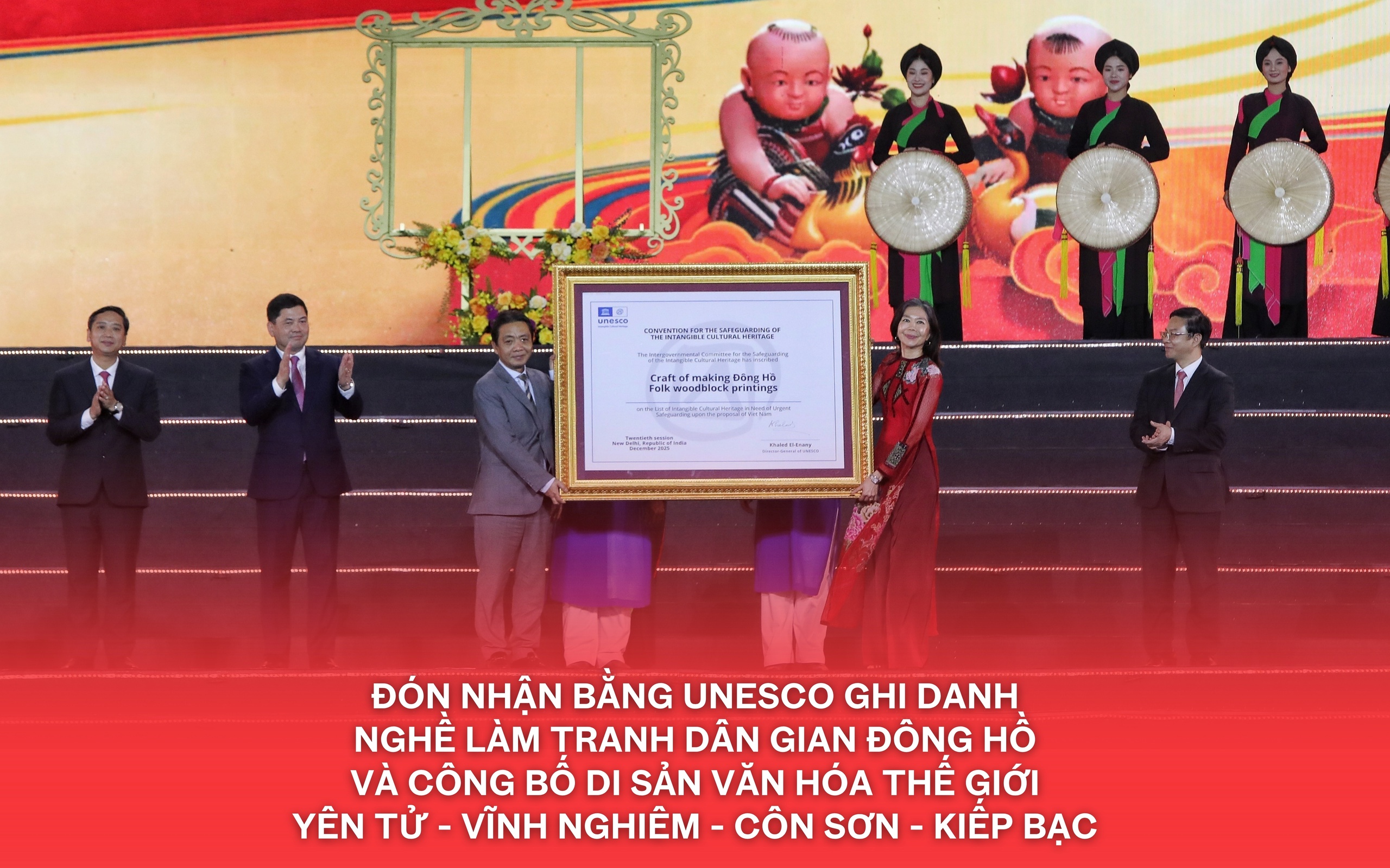 Tối 27/3, tại Quảng trường 3/2, phường Bắc Giang, Tỉnh ủy, Hội đồng nhân dân, Ủy ban nhân dân, Ủy ban Mặt trận Tổ quốc tỉnh Bắc Ninh tổ chức Lễ đón nhận Bằng của UNESCO ghi danh Nghề làm tranh dân gian Đông Hồ vào Danh sách Di sản văn hóa phi vật thể cần bảo vệ khẩn cấp; công bố Quần thể di tích và danh thắng Yên Tử - Vĩnh Nghiêm - Côn Sơn - Kiếp Bạc là Di sản văn hóa thế giới; đồng thời khai mạc Festival “Về miền di sản Bắc Ninh 2026”.
