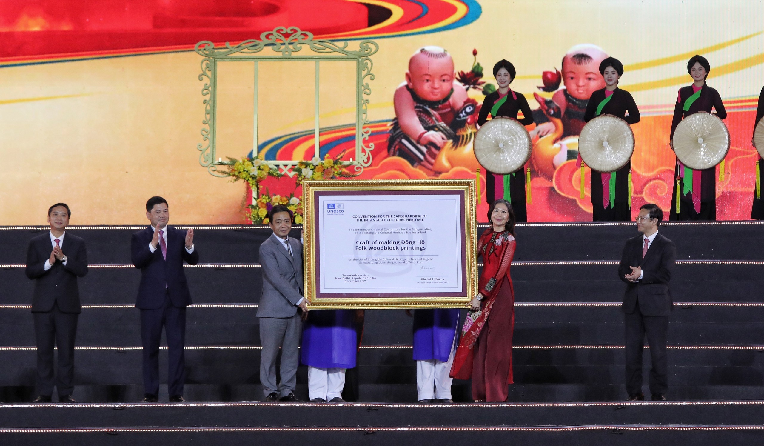 Tại buổi lễ, bà Pauline Tamesis, Điều phối viên thường trú Liên hợp quốc tại Việt Nam trao Bằng của UNESCO ghi danh Nghề làm tranh dân gian Đông Hồ vào Danh sách Di sản văn hóa phi vật thể cần bảo vệ khẩn cấp cho đại diện lãnh đạo Bộ Văn hóa, Thể thao và Du lịch cùng Đảng bộ, chính quyền và nhân dân tỉnh Bắc Ninh.
