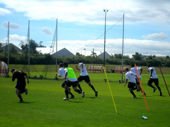 Cường (áo xanh) trên sân tập Học viện bóng đá Liverpool