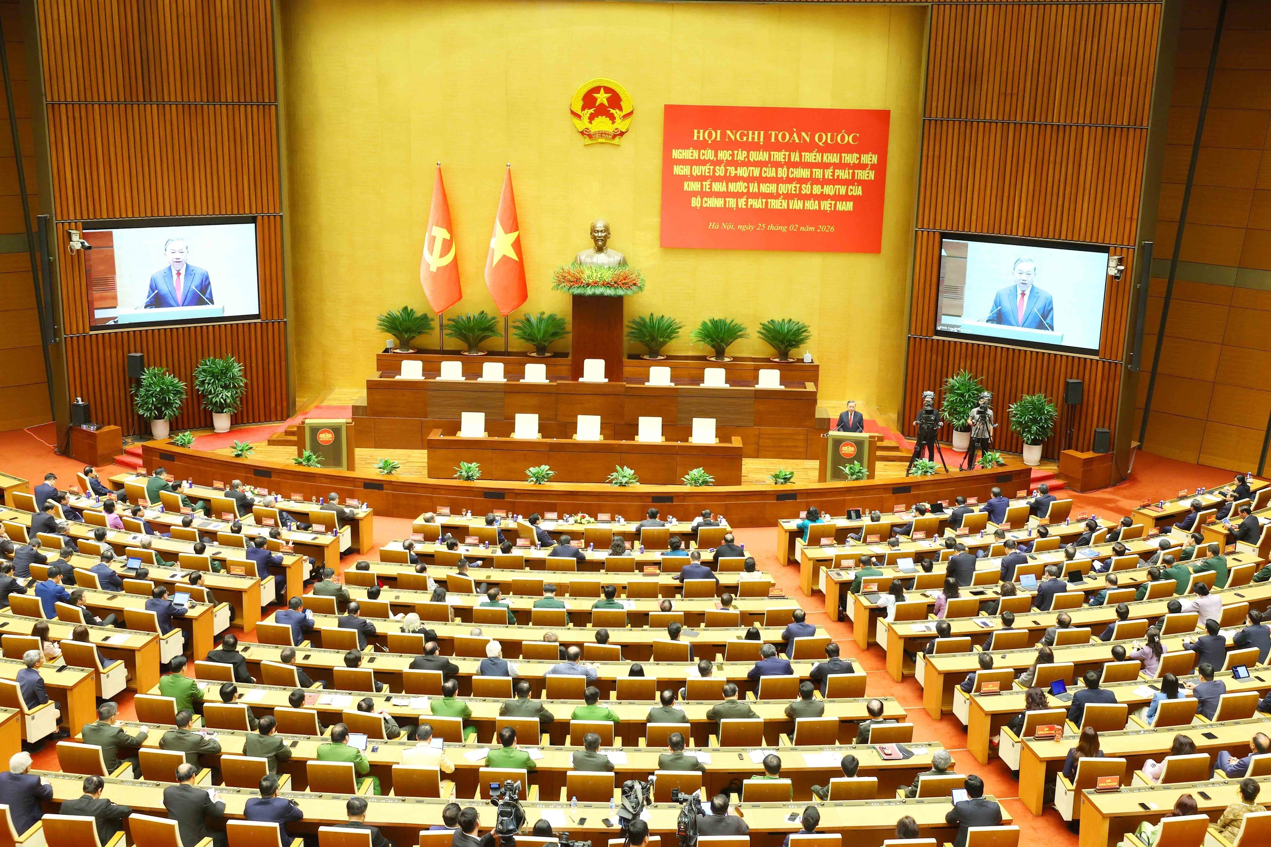 Quang cảnh Hội nghị toàn quốc nghiên cứu, học tập, quán triệt và triển khai thực hiện Nghị quyết 79-NQ/TW và Nghị quyết 80-NQ/TW, ngày 25/2/2026. Trong ảnh: Tổng Bí thư Tô Lâm dự và phát biểu chỉ đạo hội nghị