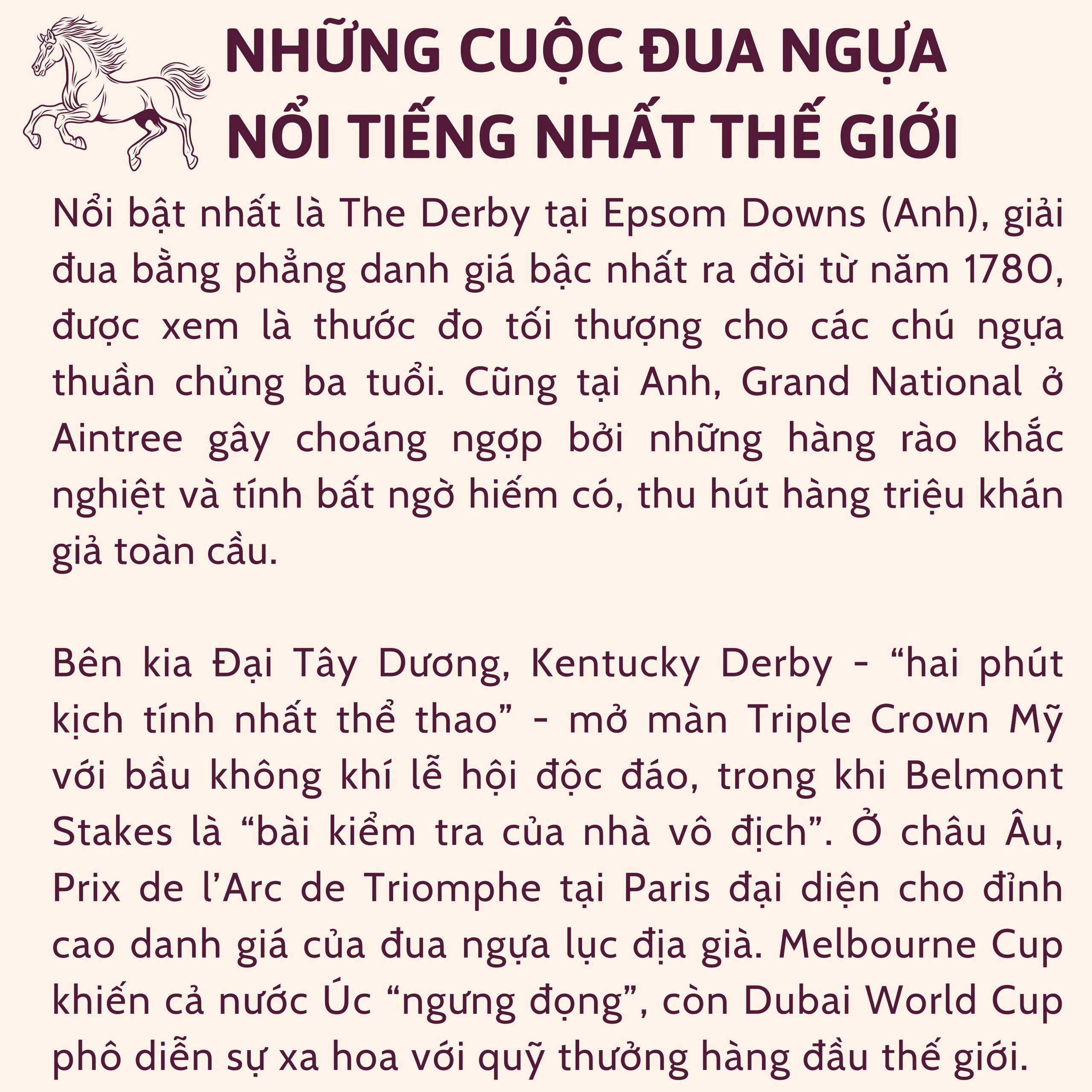 Đua ngựa không chỉ là một môn thể thao, mà là một nghi lễ xã hội mang đậm màu sắc quý tộc. Các sự kiện lớn như Royal Ascot (Anh), Prix de l'Arc de Triomphe (Pháp), Kentucky Derby (Mỹ) hay Melbourne Cup (Úc) không đơn thuần là cuộc tranh tài tốc độ, mà là những ngày hội văn hóa - nơi thể thao, thời trang, kinh doanh và ngoại giao xã hội giao thoa.