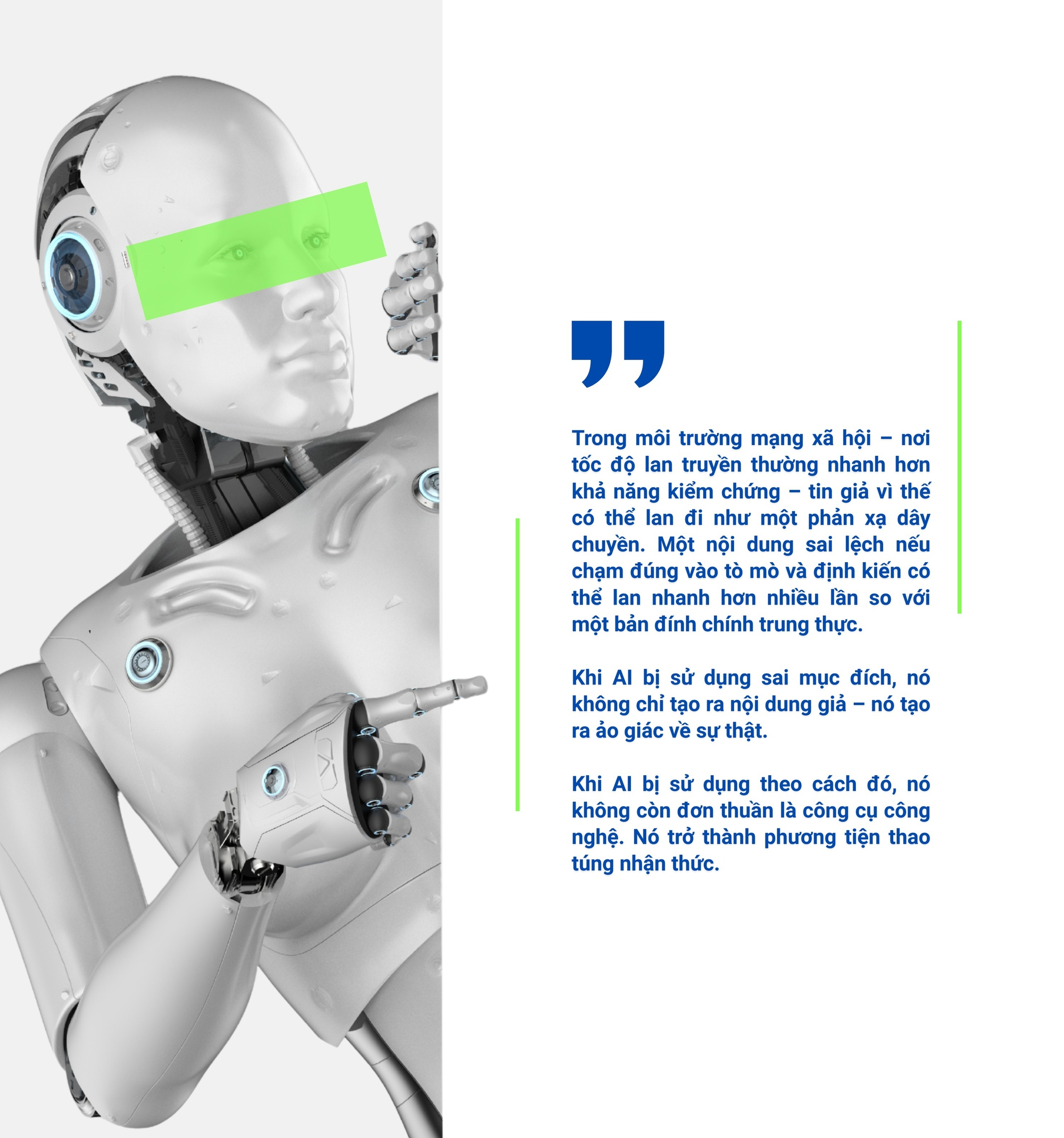 Cái nguy của AI không chỉ nằm ở khả năng tạo ra nội dung giả, mà ở chỗ nó tạo ra ảo giác về tính xác thực. Con người có xu hướng tin vào điều mình nhìn thấy trước mắt, nhất là khi nội dung ấy đánh trúng tâm lý tò mò, phẫn nộ hoặc hoài nghi.