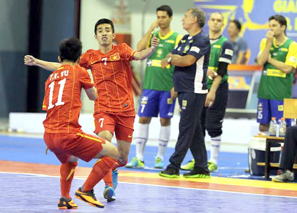 Các cầu thủ ĐT Việt Nam ăn mừng chiến thắng trước sự ngỡ ngàng của ĐT Brazil. Ảnh: Quang Nhựt