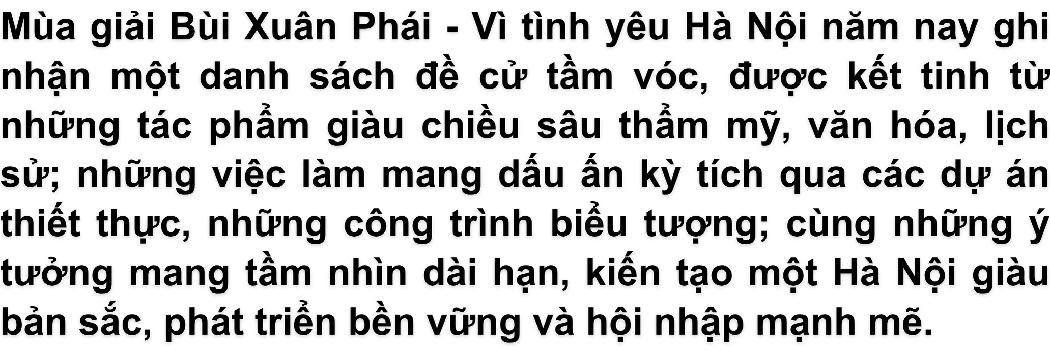 Mùa giải Bùi Xuân Phái - Vì tình yêu Hà Nội năm nay ghi nhận một danh sách đề cử tầm vóc, được kết tinh từ những tác phẩm giàu chiều sâu thẩm mỹ, văn hóa, lịch sử; những việc làm mang dấu ấn kỳ tích qua các dự án thiết thực, những công trình biểu tượng; cùng những ý tưởng mang tầm nhìn dài hạn, kiến tạo một Hà Nội giàu bản sắc, phát triển bền vững và hội nhập mạnh mẽ.