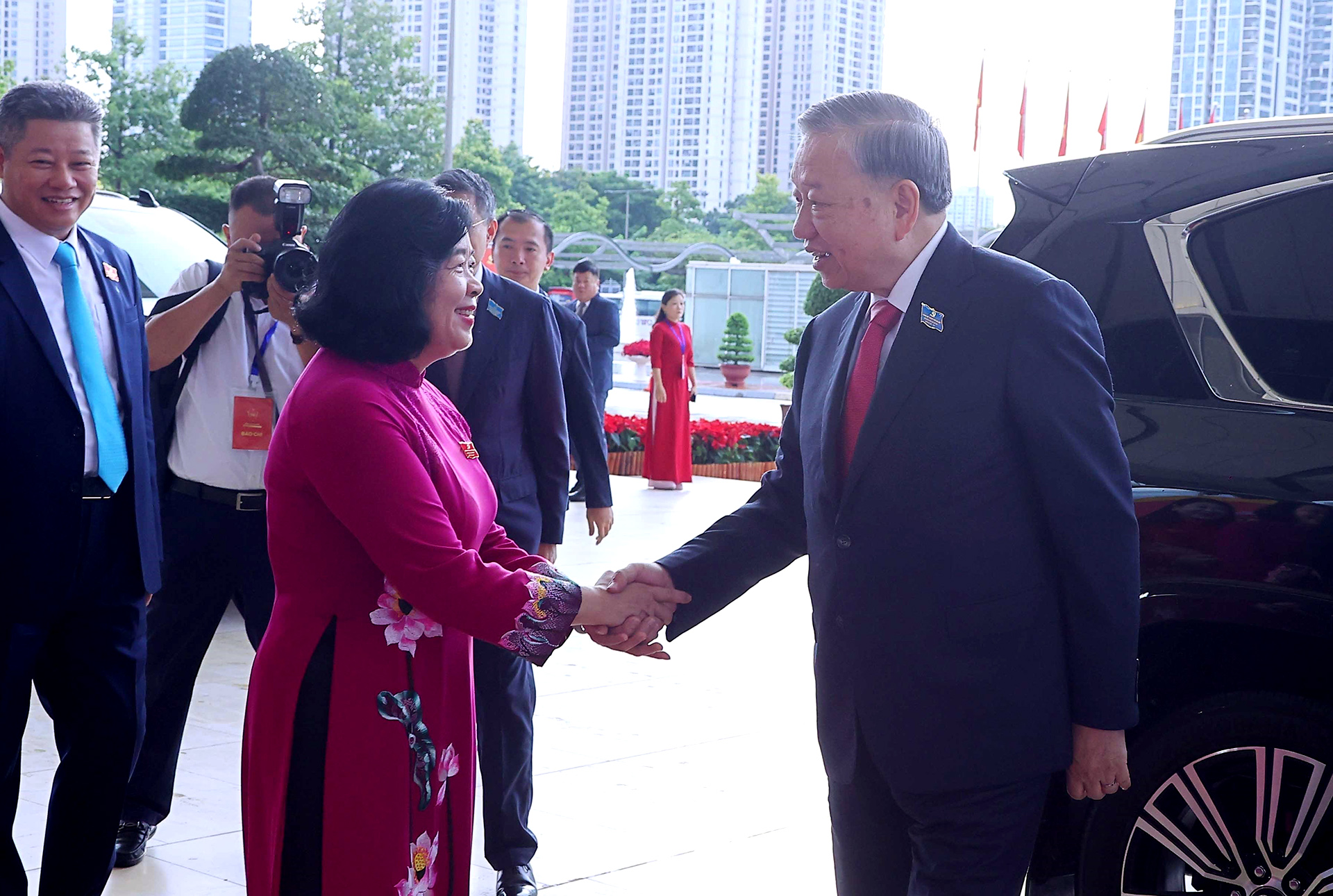 Đồng chí Bùi Thị Minh Hoài, Ủy viên Bộ Chính trị, Bí thư Thành ủy Hà Nội đón Tổng Bí thư Tô Lâm đến dự Đại hội đại biểu Đảng bộ thành phố Hà Nội lần thứ 18, nhiệm kỳ 2025-2030