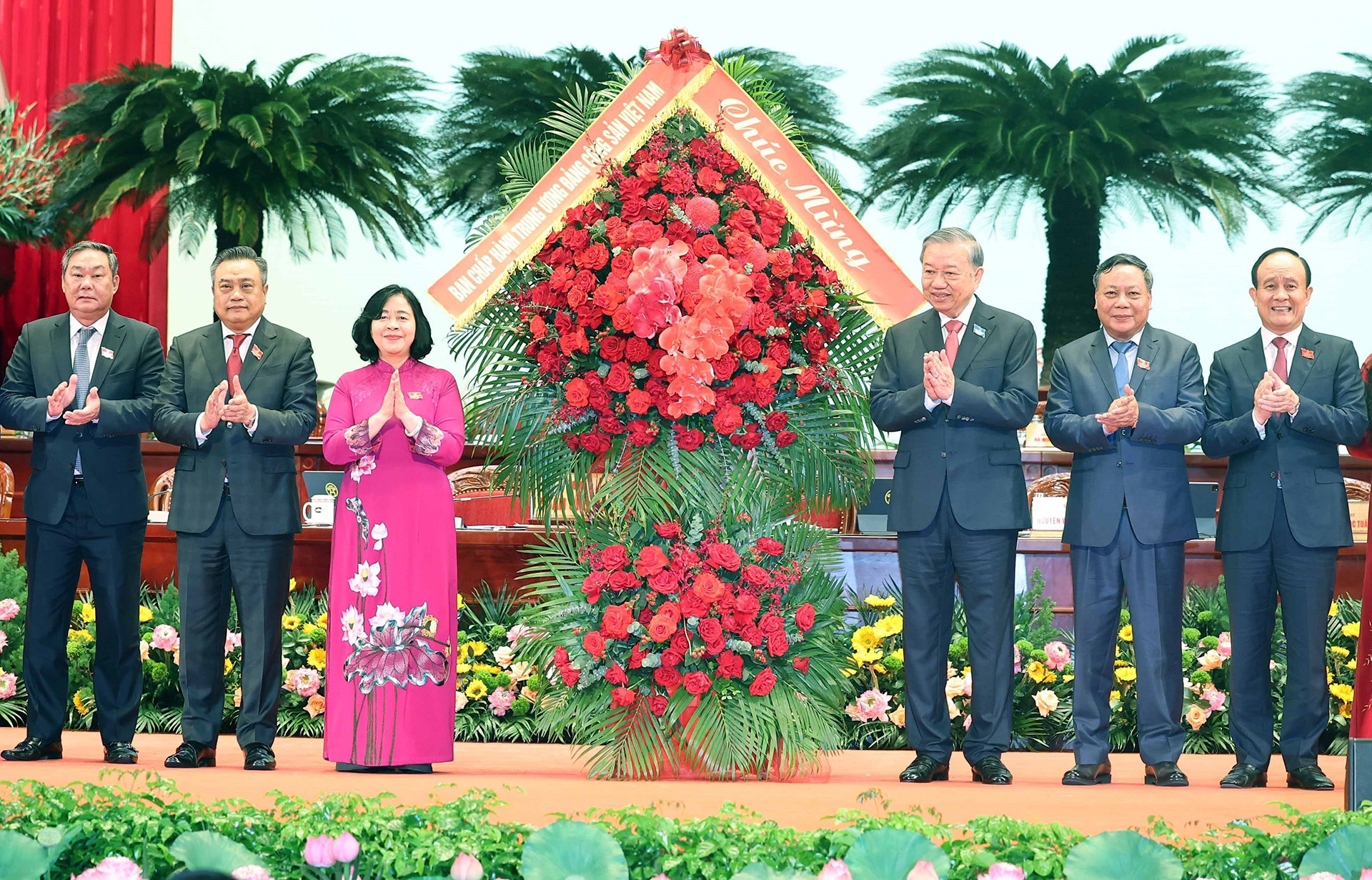 Tổng Bí thư Tô Lâm tặng hoa chúc mừng Đại hội đại biểu Đảng bộ thành phố Hà Nội lần thứ 18
