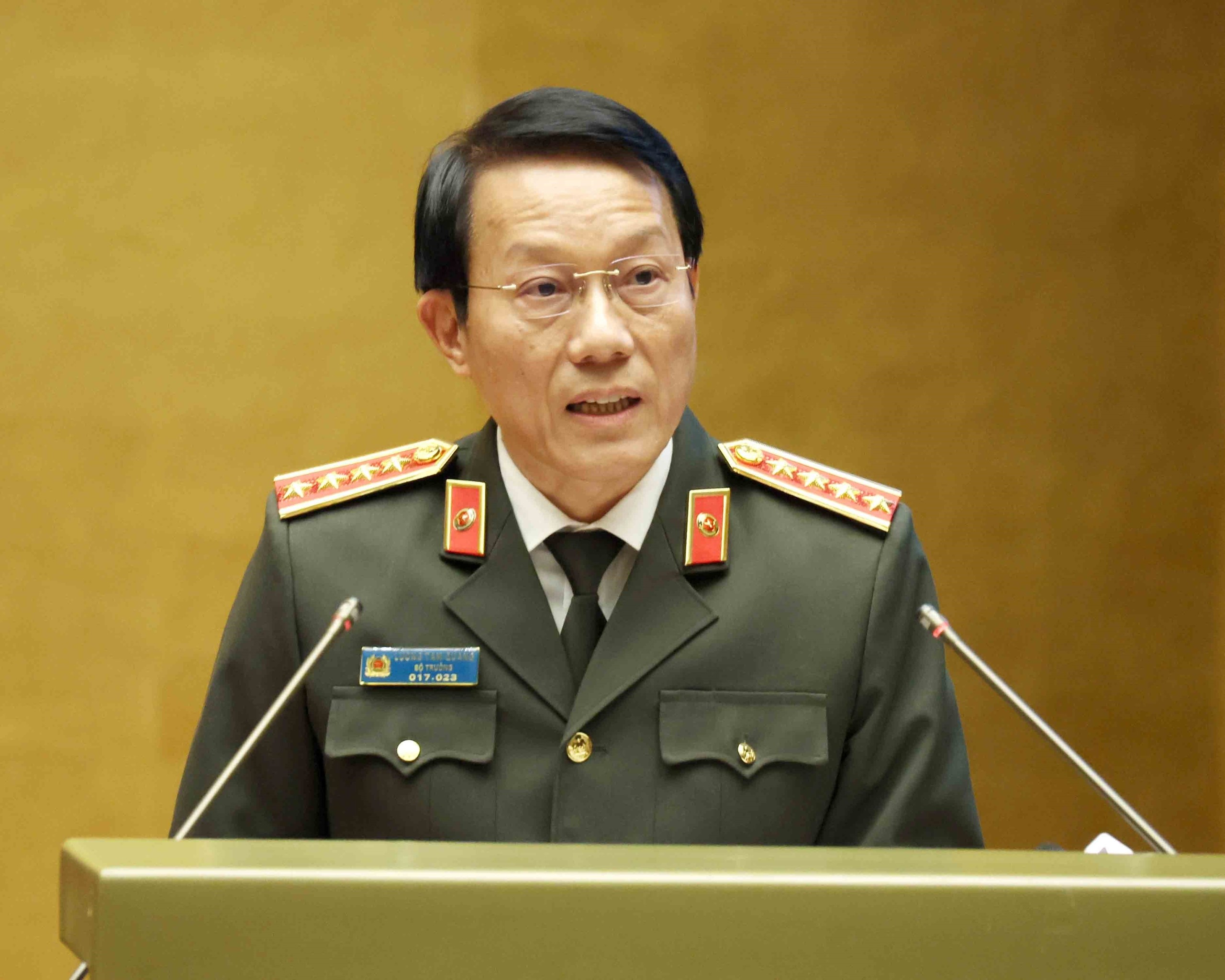 Đại tướng Lương Tam Quang, Uỷ viên Bộ Chính trị, Bộ trưởng Bộ Công an giới thiệu Chuyên đề: "Tư duy, nhận thức mới về An ninh trong Nghị quyết Đại hội XIV của Đảng". Ảnh: Phương Hoa - TTXVN