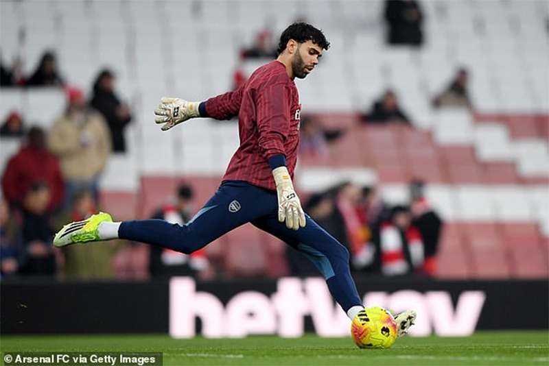 Phút 90+4.: Một cú lốp của Bruno Fernandes khi thấy Raya lên hơi cao, nhưng bóng đi vọt xà