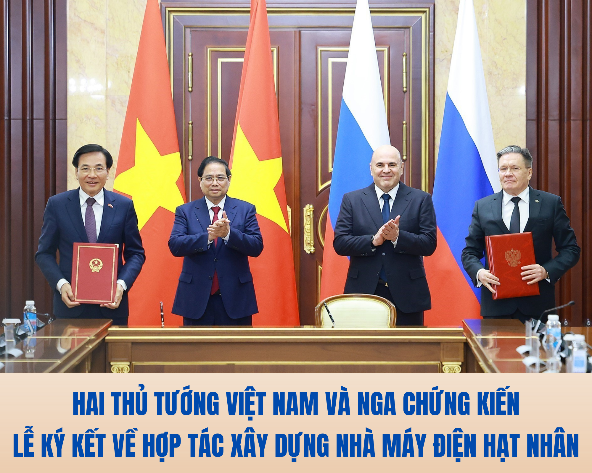 Ngay sau hội đàm, chiều 23/3/2026, giờ địa phương (tối cùng ngày, giờ Hà Nội), tại thủ đô Moskva, Thủ tướng Phạm Minh Chính và Thủ tướng Liên bang Nga Mikhail Mishustin chứng kiến Lễ ký kết Hiệp định về hợp tác xây dựng Nhà máy điện hạt nhân trên lãnh thổ Việt Nam.