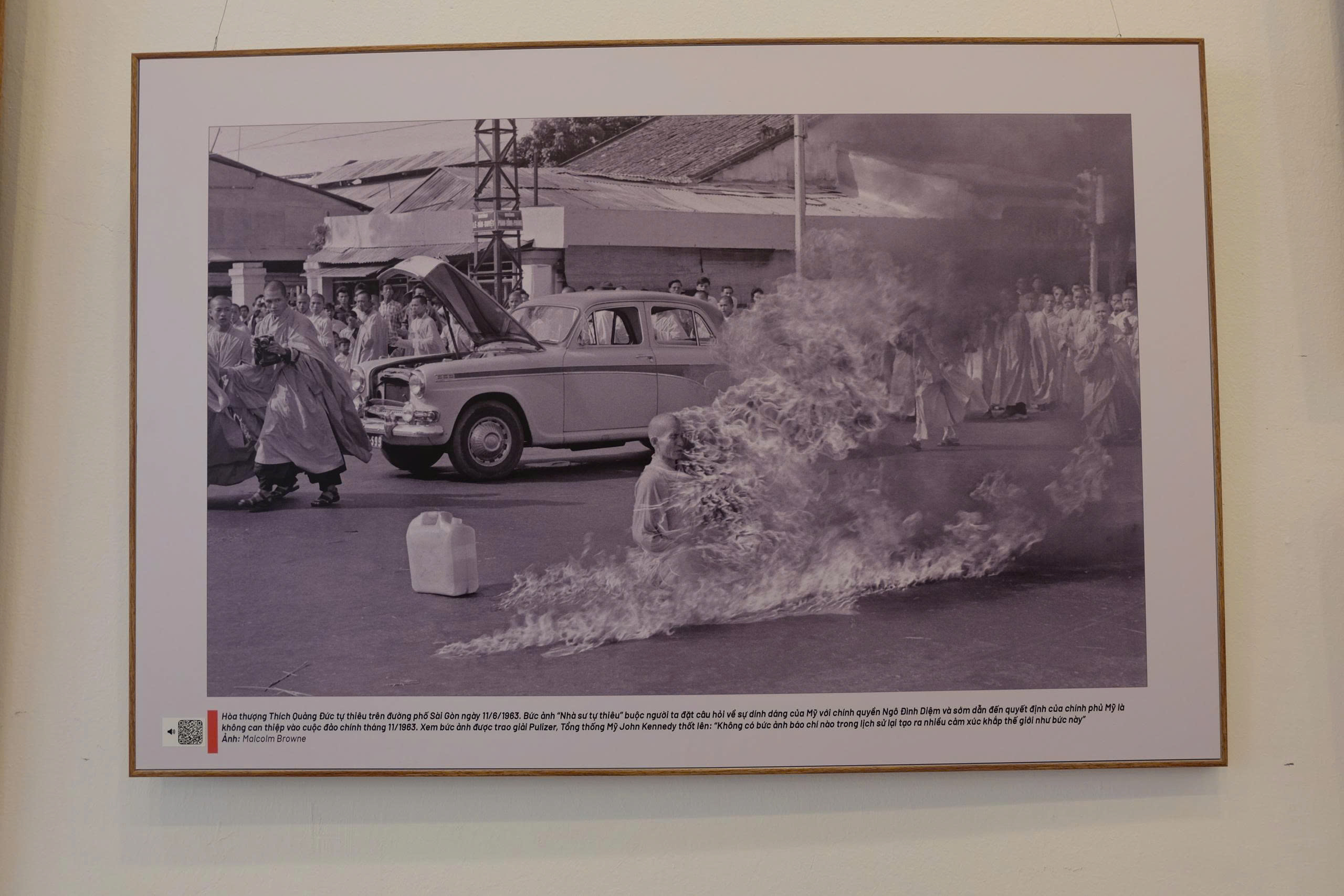 Điểm nhấn hiện đại của triển lãm là việc áp dụng công nghệ số. Mỗi bức ảnh không chỉ đứng lặng lẽ trên vách ngăn, mà được gắn mã QR giúp người xem dễ dàng tiếp cận nội dung chi tiết, bối cảnh lịch sử và những câu chuyện ẩn sau từng khuôn hình.