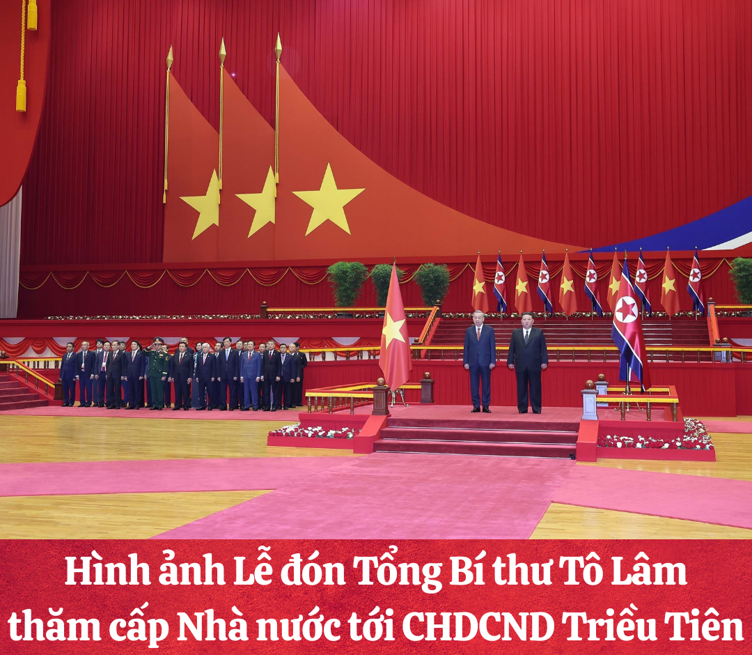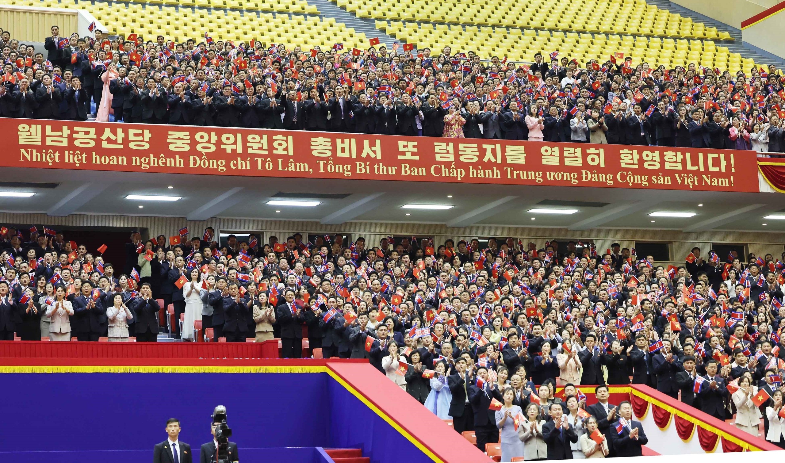 Sáng 9/10/2025, tại Cung Thể thao Bình Nhưỡng, Tổng Bí thư Đảng Lao động Triều Tiên, Chủ tịch Quốc vụ nước Cộng hòa Dân chủ Nhân dân Triều Tiên Kim Jong Un chủ trì Lễ đón trọng thể Tổng Bí thư Tô Lâm và Đoàn đại biểu cấp cao Việt Nam thăm cấp Nhà nước tới Triều Tiên.