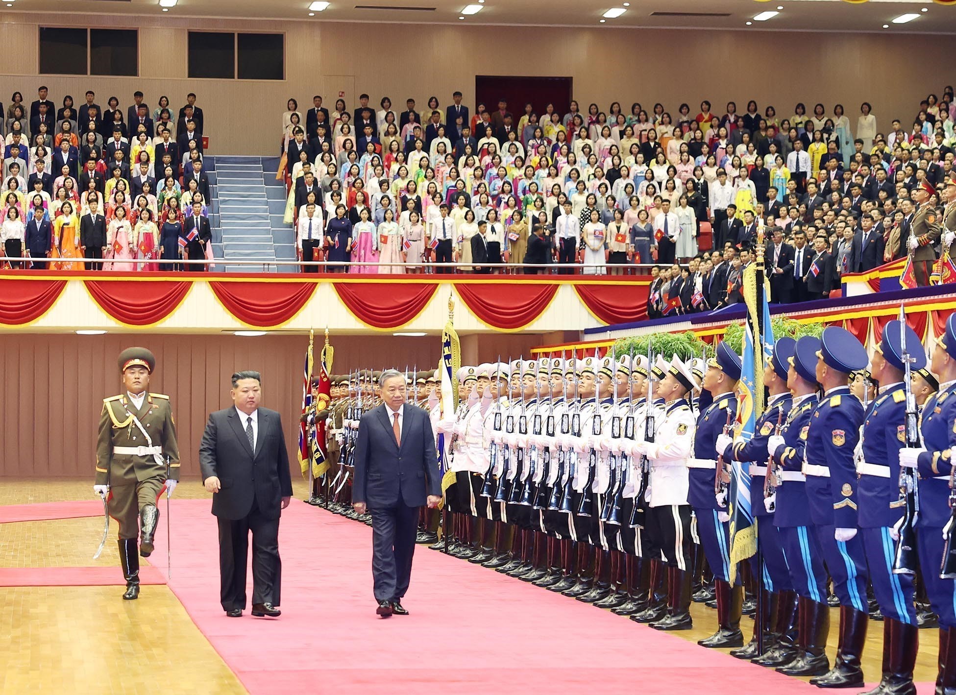 Tổng Bí thư Tô Lâm và Tổng Bí thư Đảng Lao động Triều Tiên, Chủ tịch Quốc vụ nước CHDCND Triều Tiên Kim Jong Un duyệt Đội danh dự. Ảnh: Thống Nhất – TTXVN