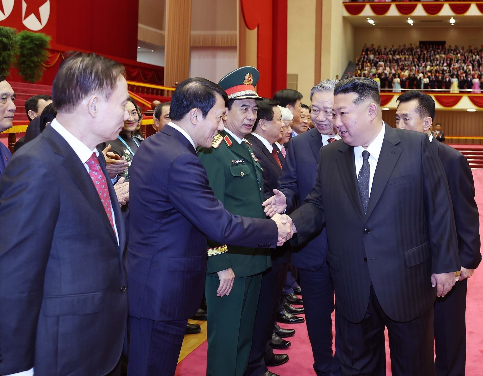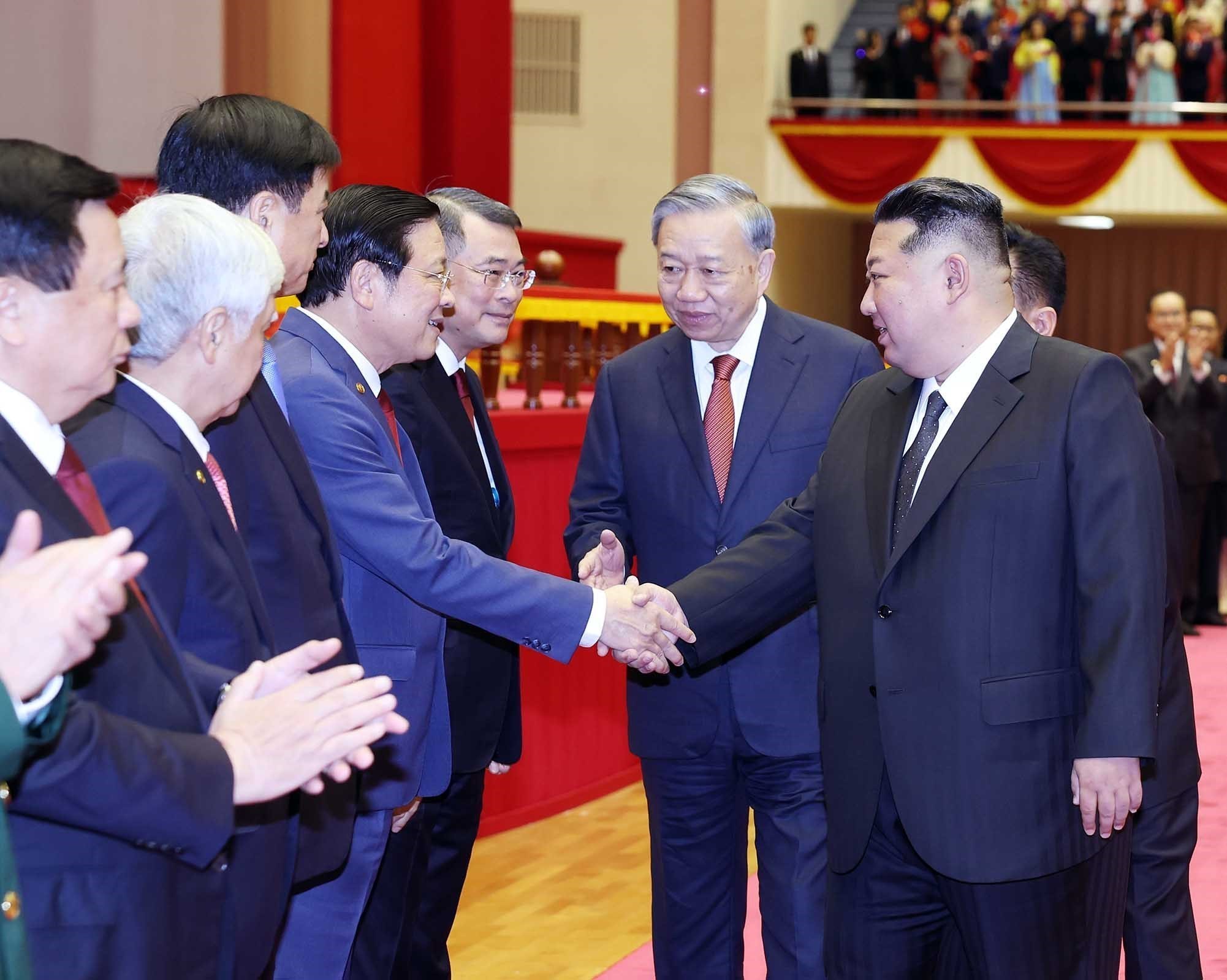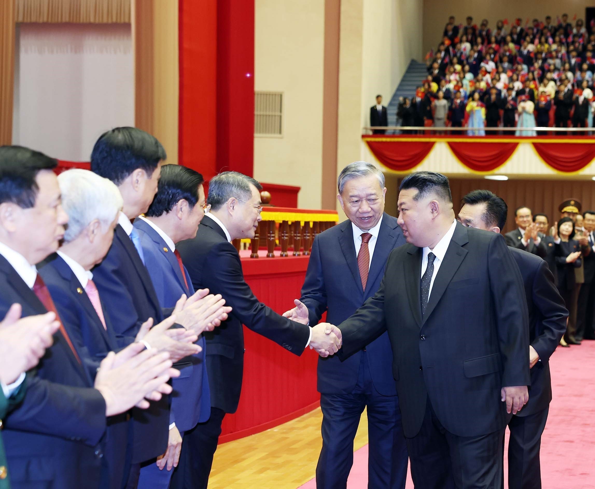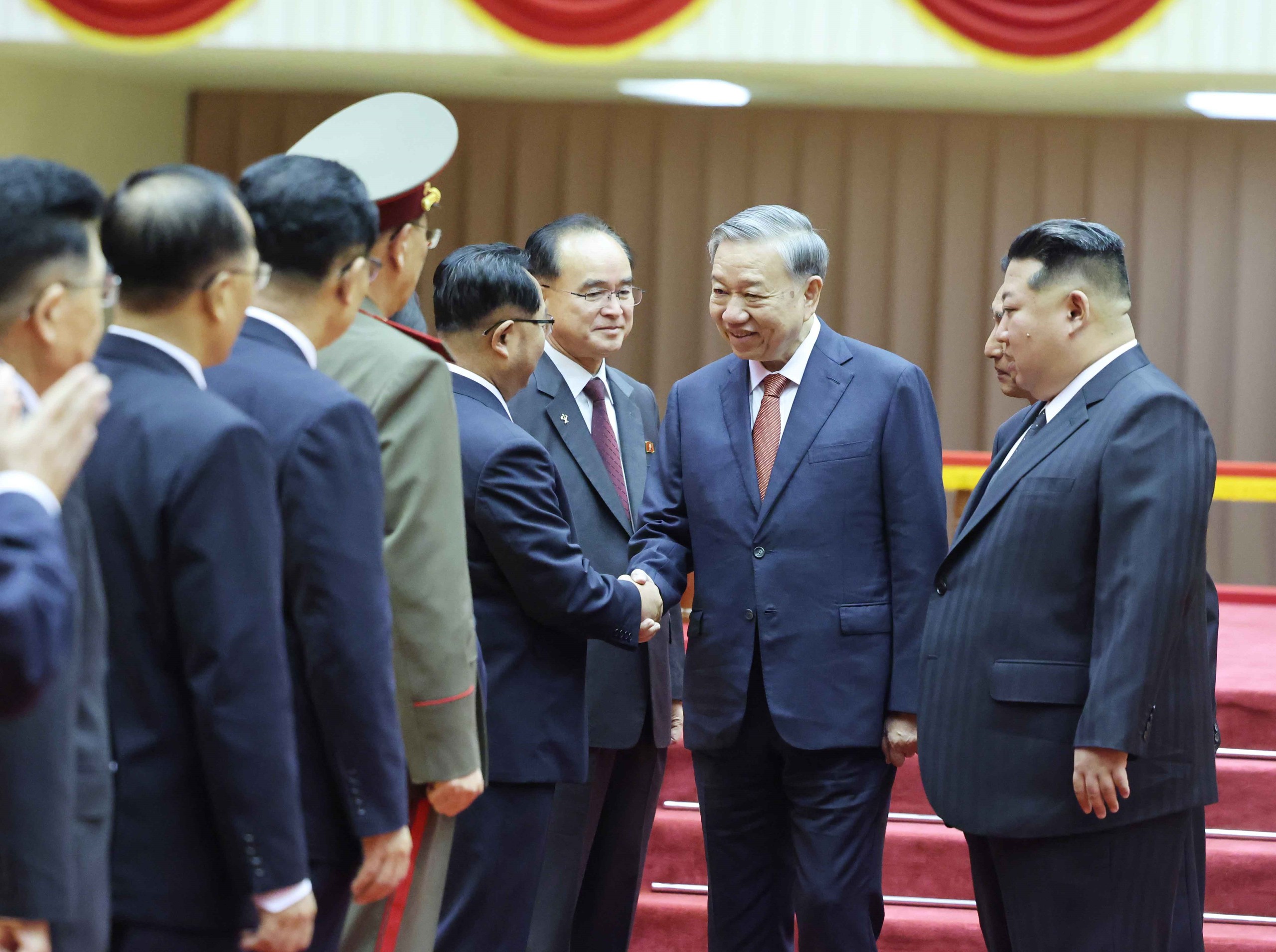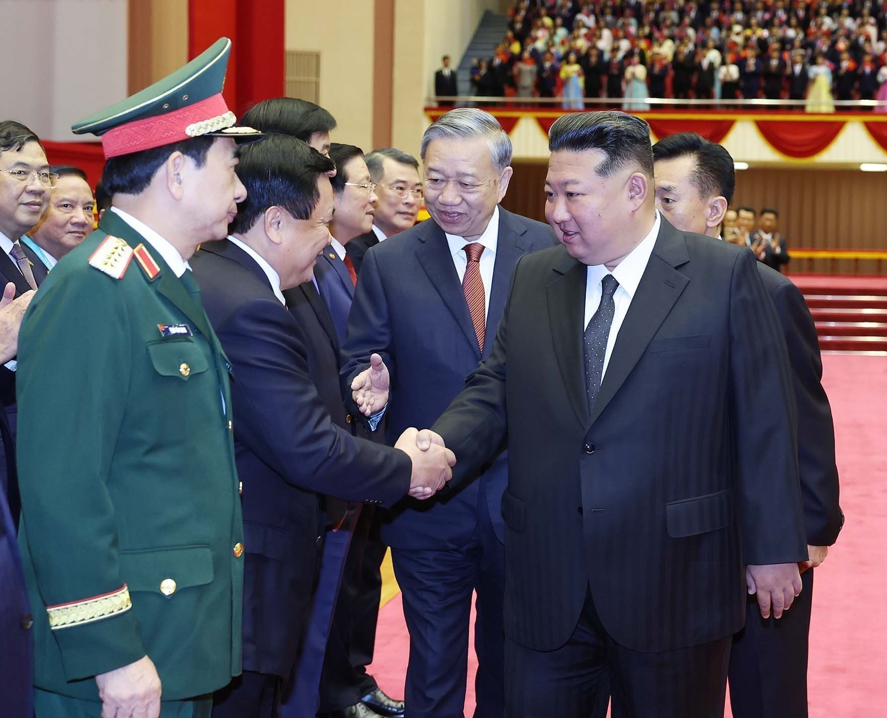 Tổng Bí thư Đảng Lao động Triều Tiên, Chủ tịch Quốc vụ nước Cộng hòa Dân chủ Nhân dân Triều Tiên Kim Jong Un đón Tổng Bí thư Tô Lâm. Ảnh: Thống Nhất – TTXVN
