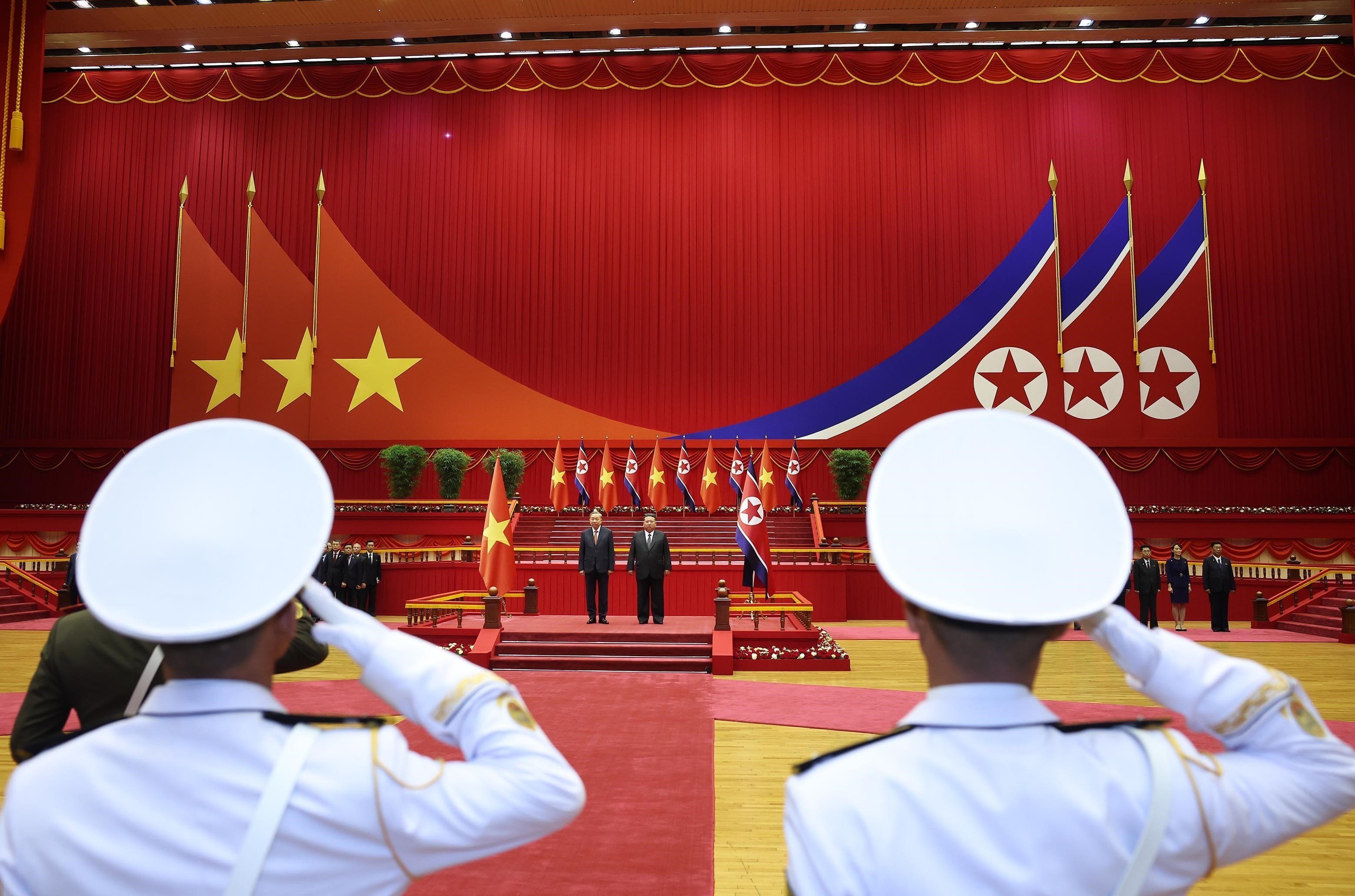 Tổng Bí thư Tô Lâm và Tổng Bí thư Đảng Lao động Triều Tiên, Chủ tịch Quốc vụ nước CHDCND Triều Tiên Kim Jong Un trên bục danh dự, nghe Quân nhạc cử Quốc thiều hai nước. Ảnh: Thống Nhất – TTXVN