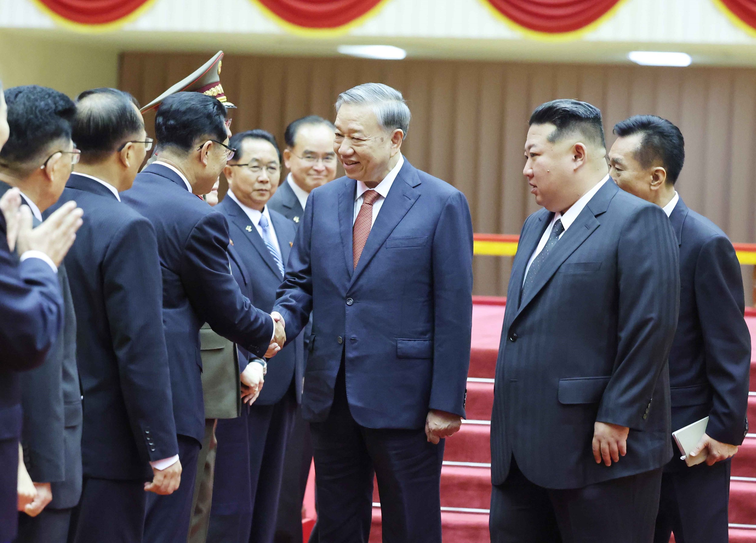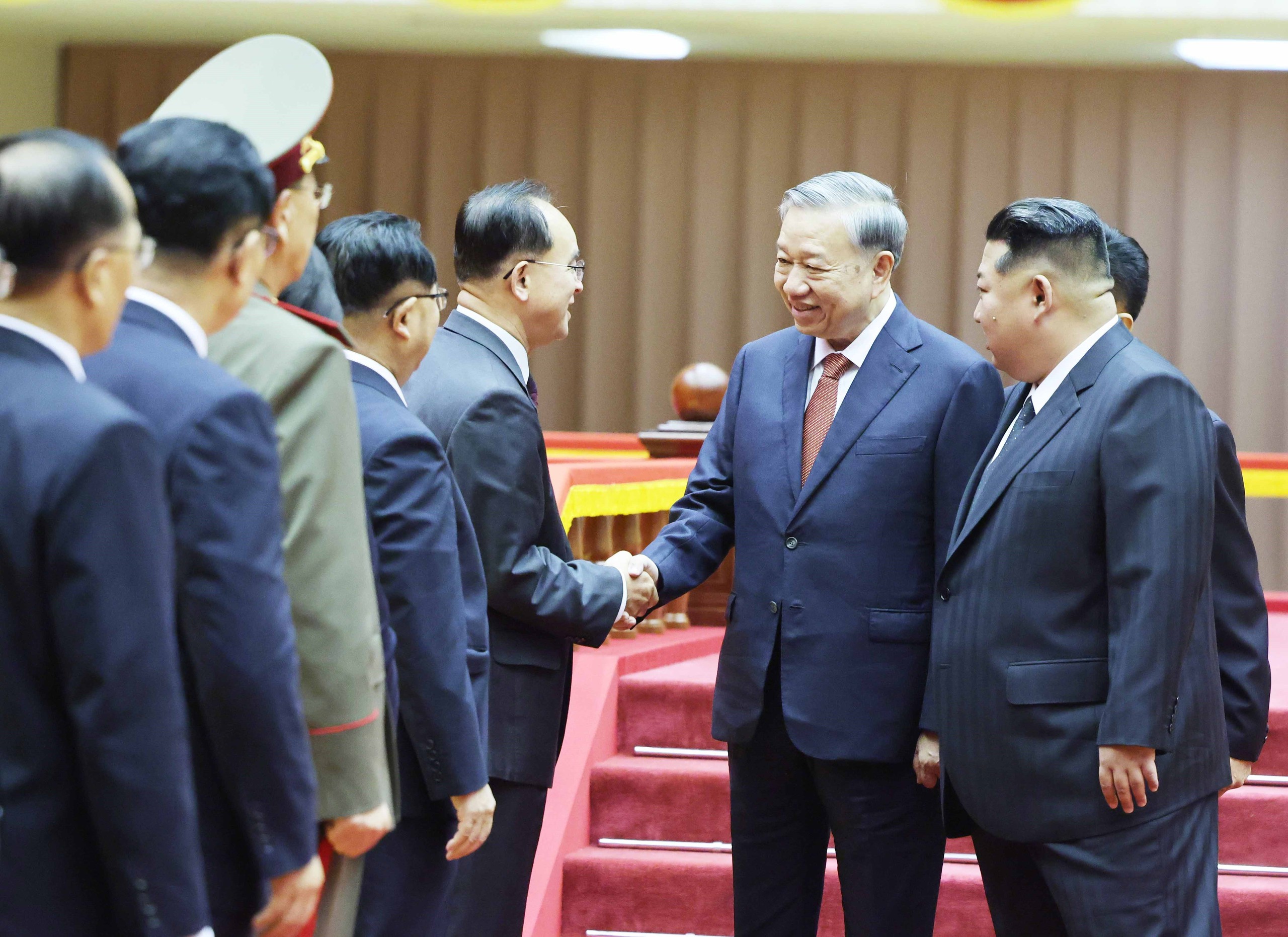 Tổng Bí thư Tô Lâm giới thiệu thành viên chính thức Đoàn cấp cao Việt Nam với Tổng Bí thư Đảng Lao động Triều Tiên, Chủ tịch Quốc vụ nước Cộng hòa Dân chủ Nhân dân Triều Tiên Kim Jong Un. Ảnh: Thống Nhất – TTXVN