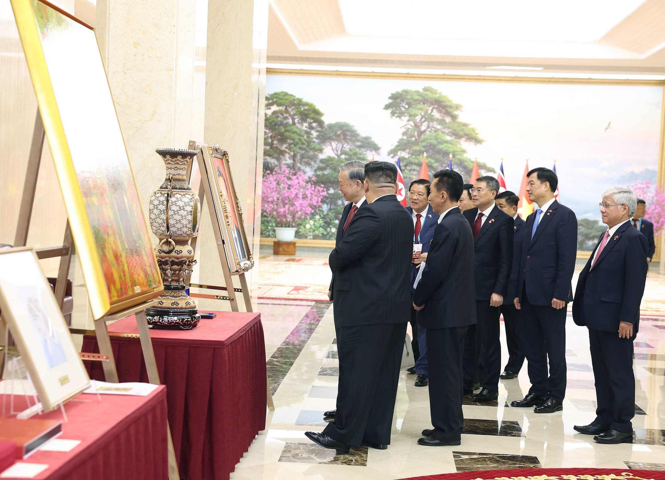 Sau khi kết thúc hội đàm, Tổng Bí thư Tô Lâm trao tặng Tổng Bí thư, Chủ tịch Quốc vụ CHDCND Triều Tiên Kim Jong Un cuốn sách ảnh "Thắm tình hữu nghị Việt Nam - Triều Tiên". Ảnh: Thống Nhất – TTXVN