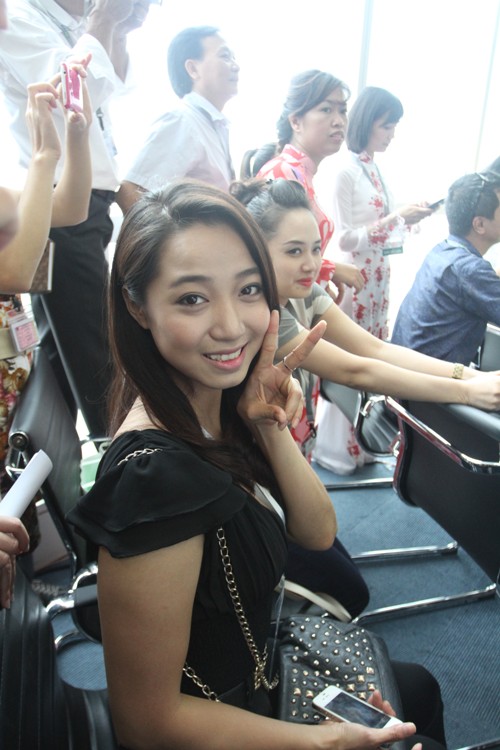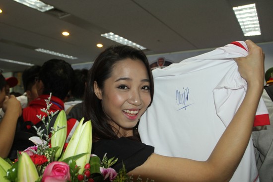 (Thethaovanhoa.vn) - Hoa khôi Wushu Vũ Thùy Linh cũng đi đón các thần tượng Arsenal và cô tự hào khoe đã có được chữ kí của Mikel Arteta.