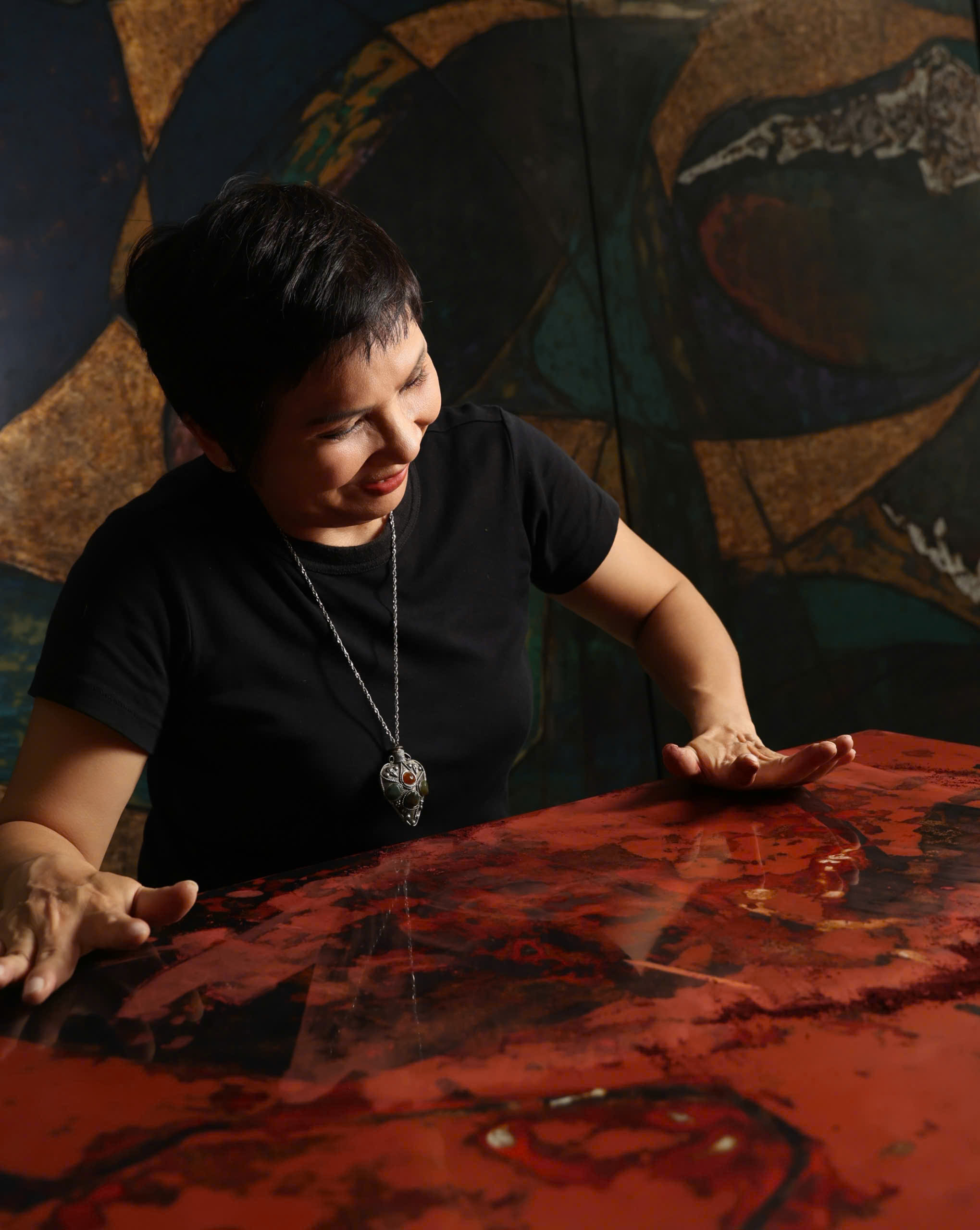 Chị không giới hạn mình trong sơn mài truyền thống trên vóc gỗ, mà mở rộng sang vóc nhựa, toan, thậm chí phát triển các cấu trúc đa tấm quy mô lớn. Có những tác phẩm trải dài gần 20 mét, như một cách "mở rộng không gian" ngay từ hình thức vật lý.
