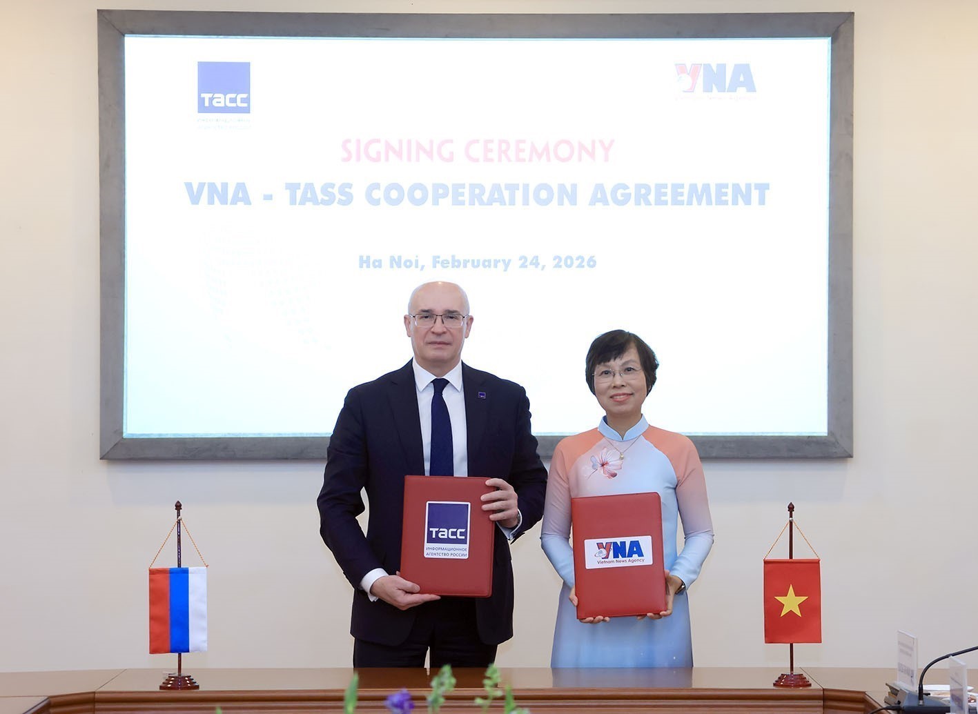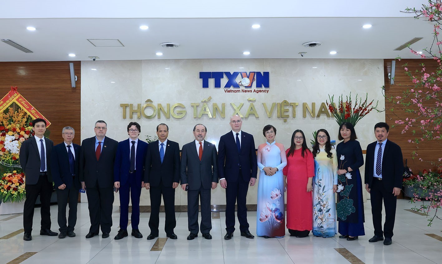 Nhận lời mời của Thông tấn xã Việt Nam, chiều 24/2/2026, tại Trung tâm Thông tấn Quốc gia, Hà Nội, đoàn lãnh đạo Hãng thông tấn TASS (Liên bang Nga) do ông Andrey Kondrashov, Tổng giám đốc dẫn đầu đã đến thăm và làm việc với Thông tấn xã Việt Nam.