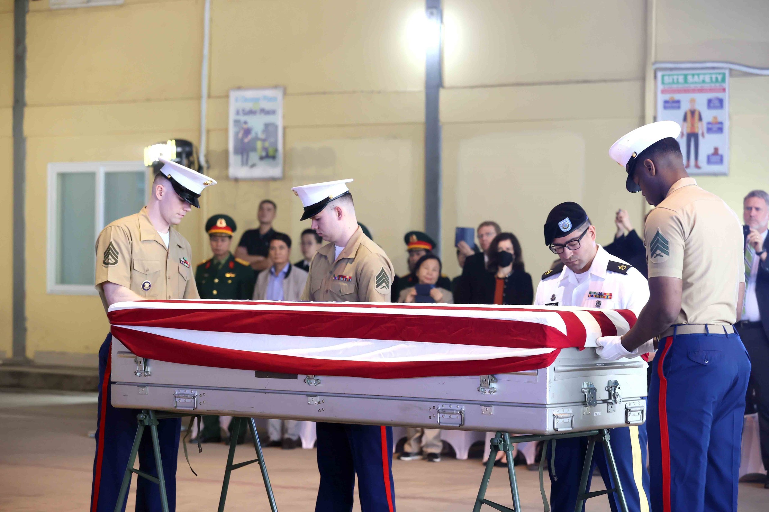 Nghi thức tiếp nhận hòm đựng hài cốt quân nhân Hoa Kỳ mất tích trong chiến tranh ở Việt Nam. Ảnh: An Đăng - TTXVN