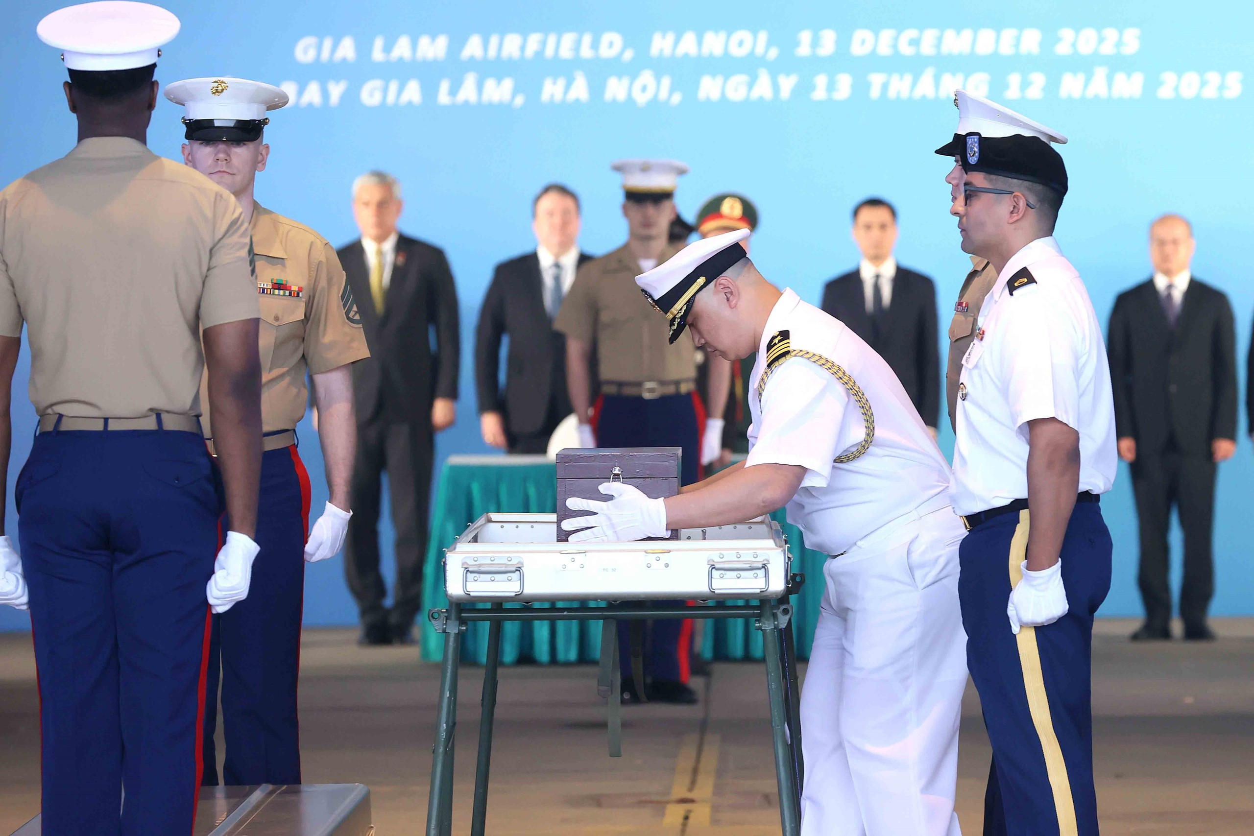 Sáng 13/12, Lễ trao trả hài cốt quân nhân Hoa Kỳ mất tích trong chiến tranh ở Việt Nam (MIA) lần thứ 171 đã diễn ra tại sân bay Gia Lâm (Hà Nội).