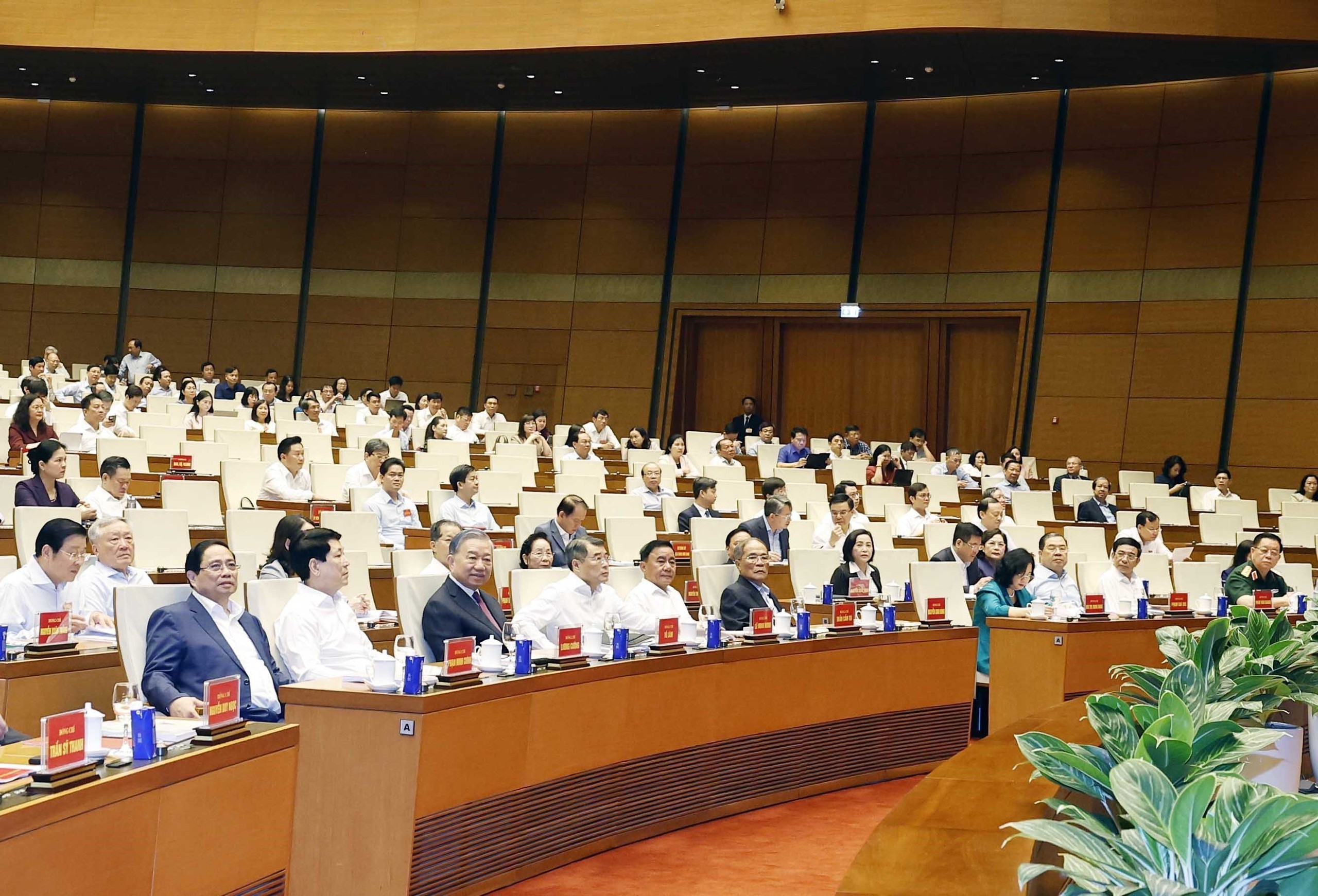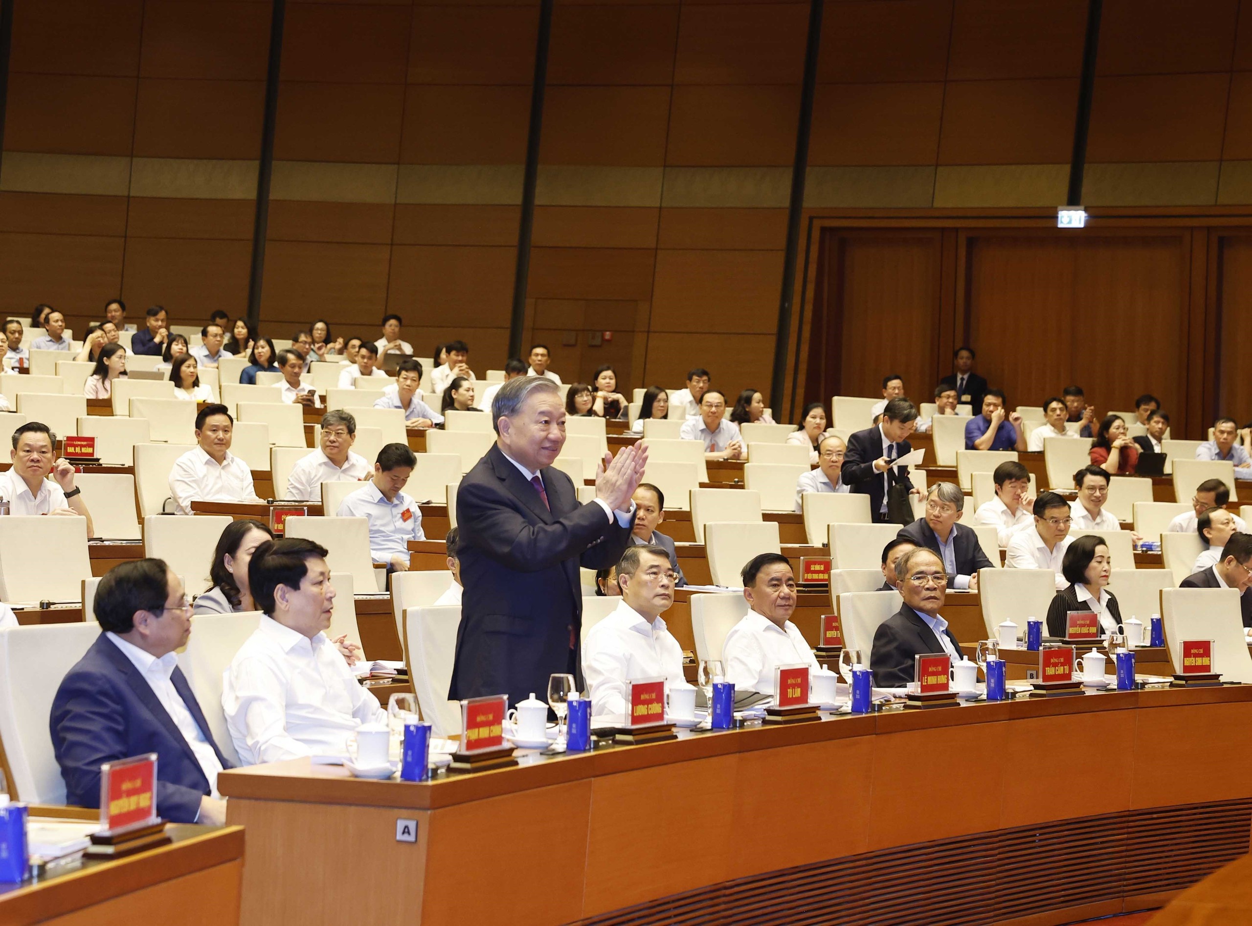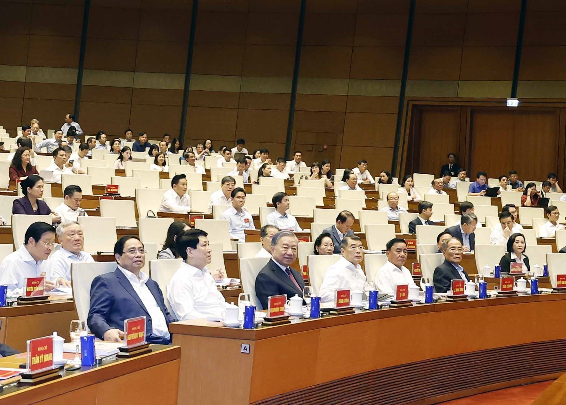Tổng Bí thư, Chủ tịch nước Tô Lâm và các đồng chí lãnh đạo, Đảng, Nhà nước cùng các đại biểu tham dự tại điểm cầu Hội trường Diên Hồng. Ảnh: TTXVN