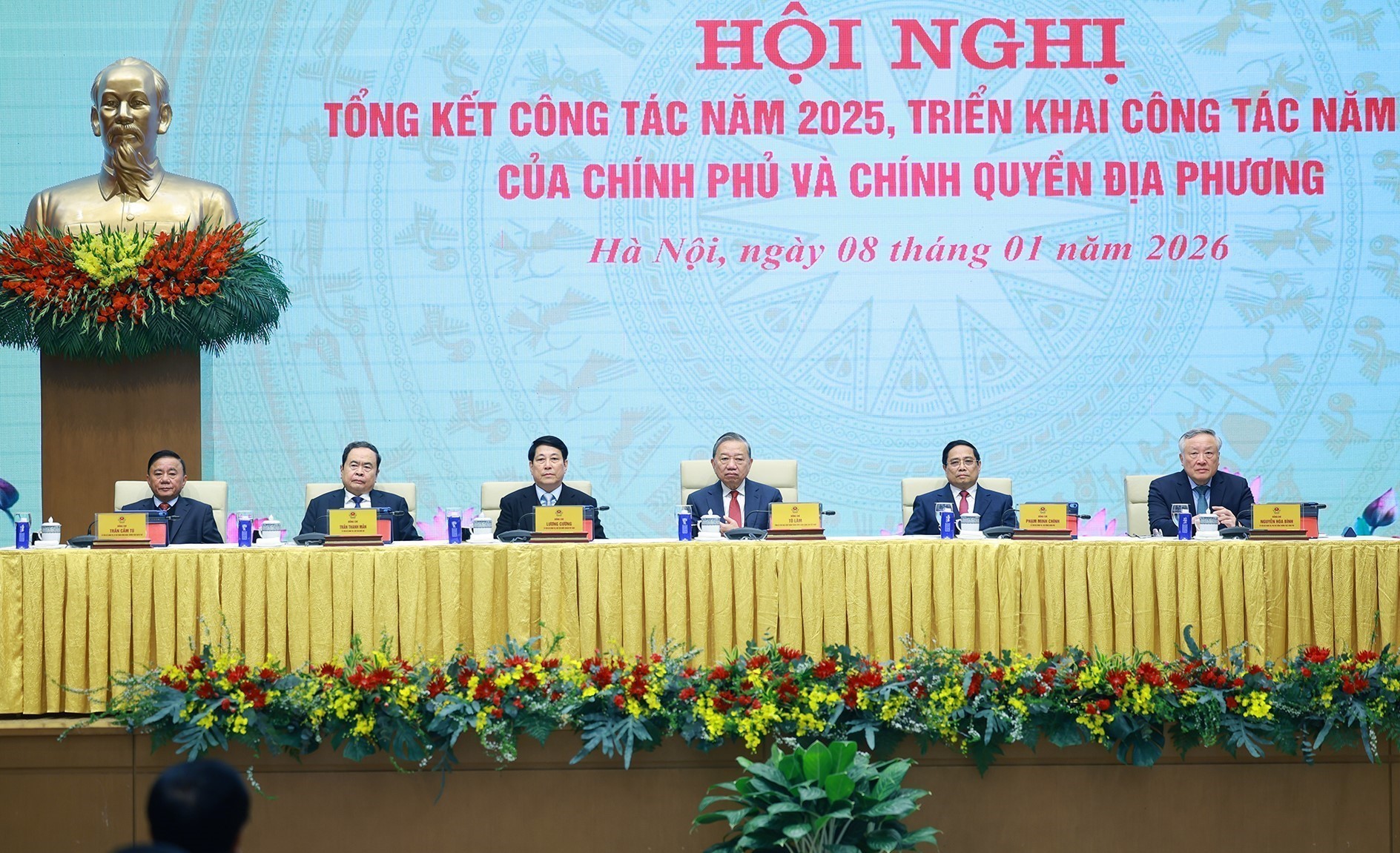 Sáng 8/1, Chính phủ tổ chức Hội nghị tổng kết công tác năm 2025, triển khai công tác năm 2026 của Chính phủ và chính quyền địa phương. Hội nghị được tổ chức trực tiếp tại trụ sở Chính phủ, trực tuyến với điểm cầu 34 tỉnh, thành phố trong cả nước.