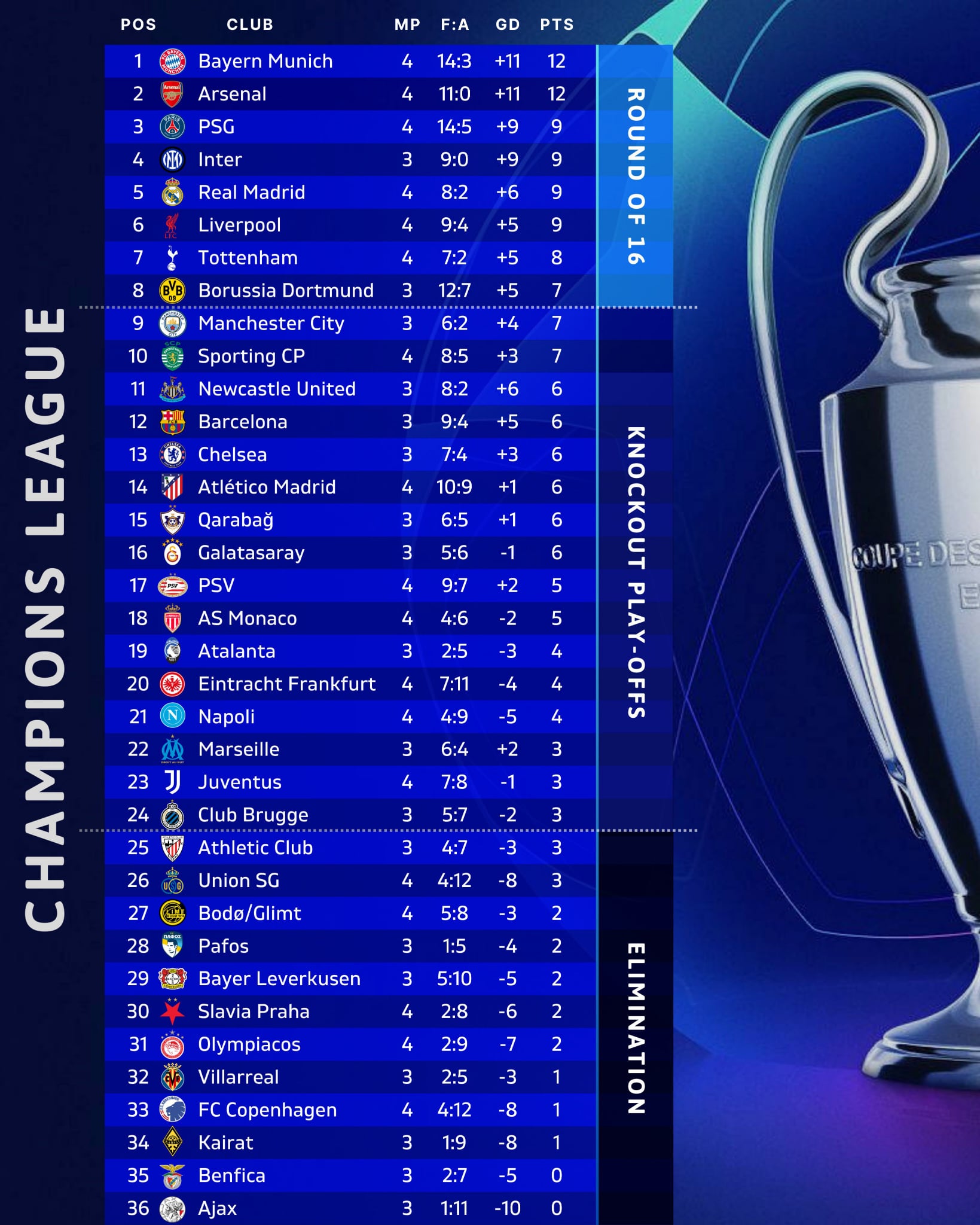Đội bóng Đức đang có khởi đầu mùa giải hết sức ấn tượng: toàn thắng 16 trận trên mọi đấu trường, bao gồm cả 4 trận đầu ở Champions League. Họ đã ghi tổng cộng 56 bàn thắng và cùng Arsenal là hai đội duy nhất đạt 12 điểm ở Champions League mùa này. Bayern Munich dẫn đầu BXH với 12 điểm sau 4 trận. Arsenal cũng có 12 điểm nhưng xếp thứ 2 do kém về hiệu số.