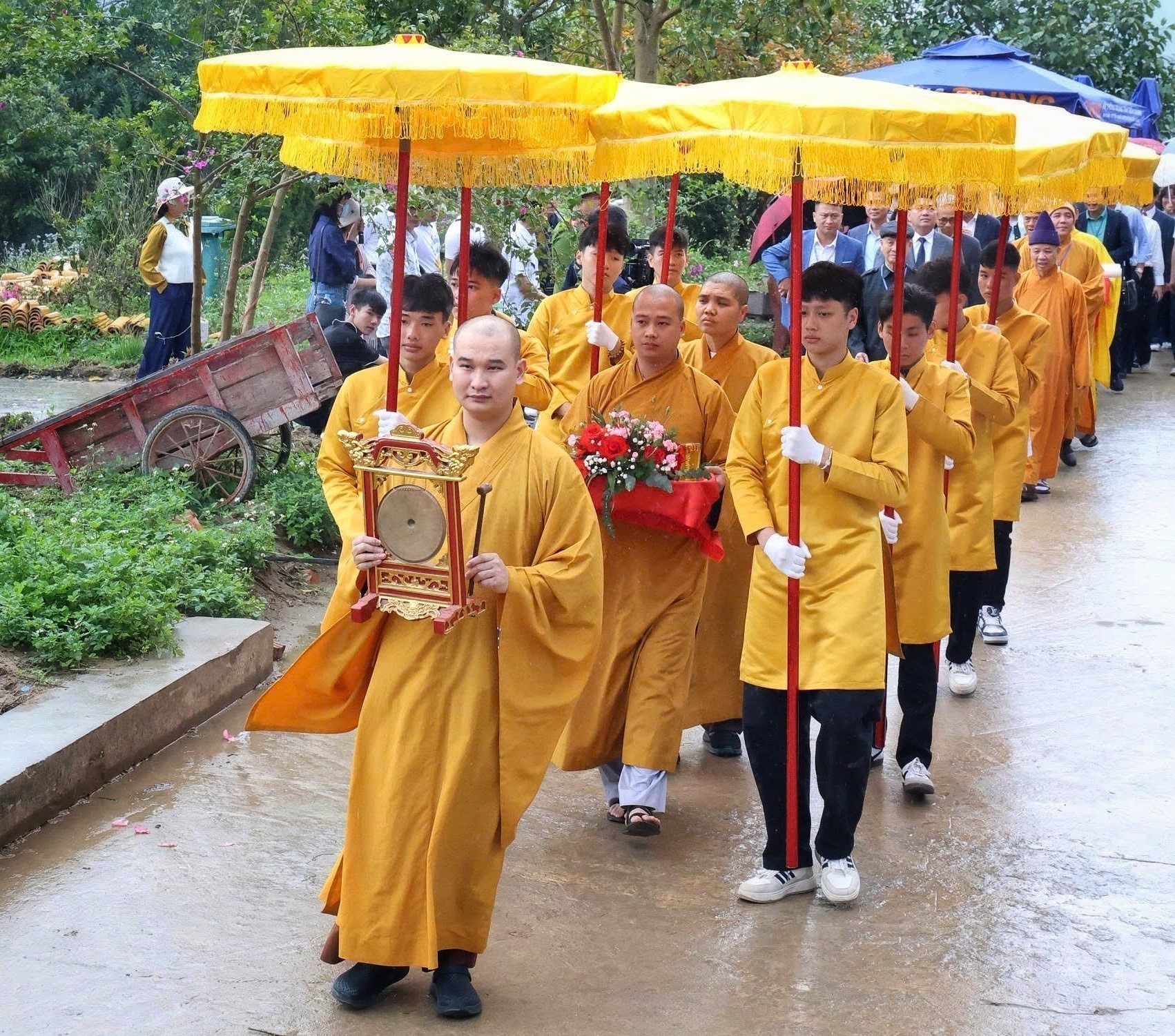 Mở đầu chương trình là những hồi trống hội rộn ràng, tiếp nối bằng các nghi thức truyền thống và chương trình nghệ thuật với chủ đề “Linh thiêng Tây Yên Tử”, tái hiện hành trình văn hóa, tâm linh gắn với vùng đất Phật giáo Trúc Lâm. Điểm nhấn của buổi lễ là nghi thức thỉnh chuông hòa bình tại tháp chuông Hoa Nghiêm, gửi gắm ước nguyện quốc thái dân an, mưa thuận gió hòa, nhân dân an lạc.