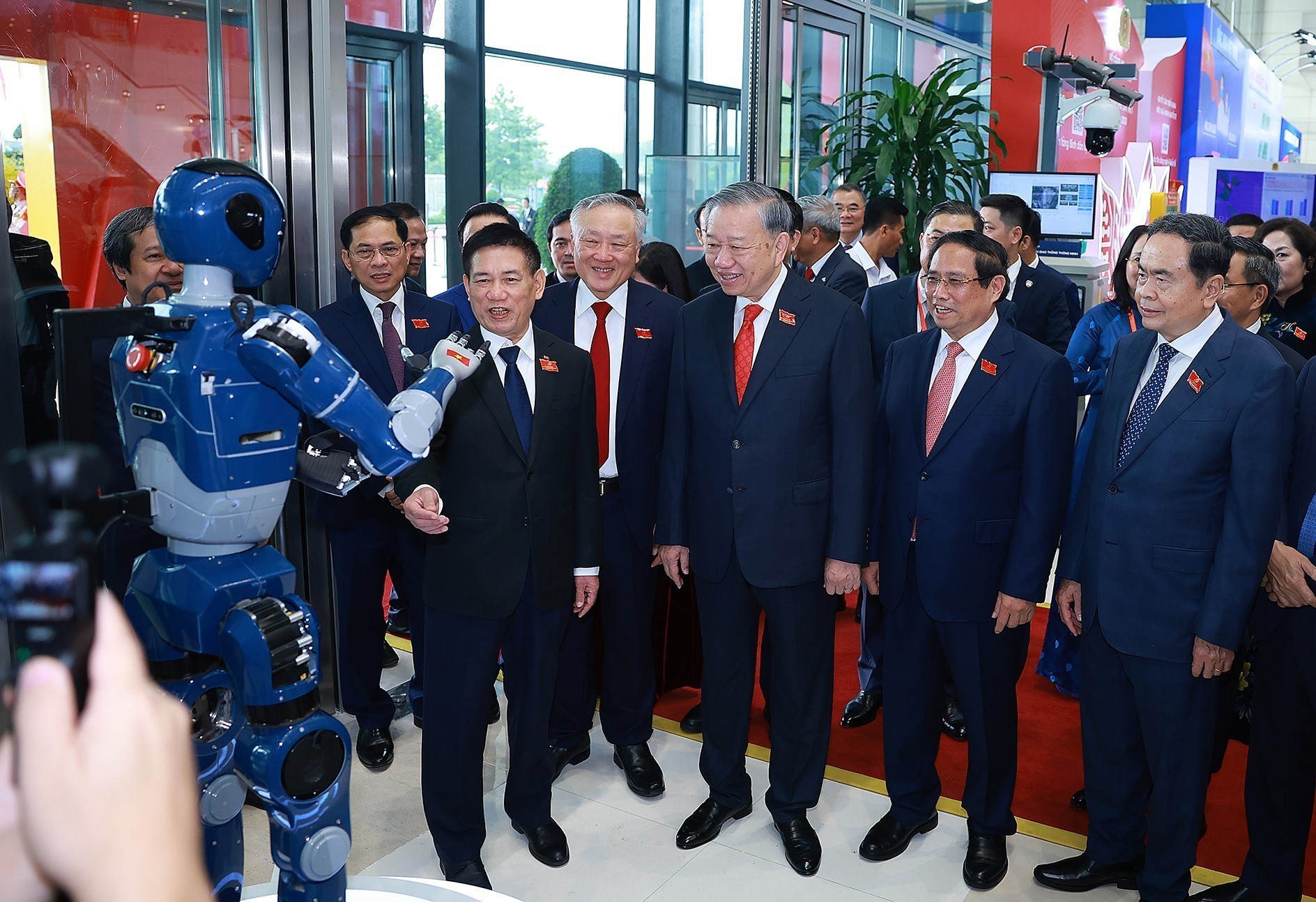 Lãnh đạo Đảng, Nhà nước tham quan triển lãm thành tựu phát triển khoa học, công nghệ và đổi mới sáng tạo và chuyển đổi số của Chính phủ. Ảnh: Dương Giang-TTXVN
