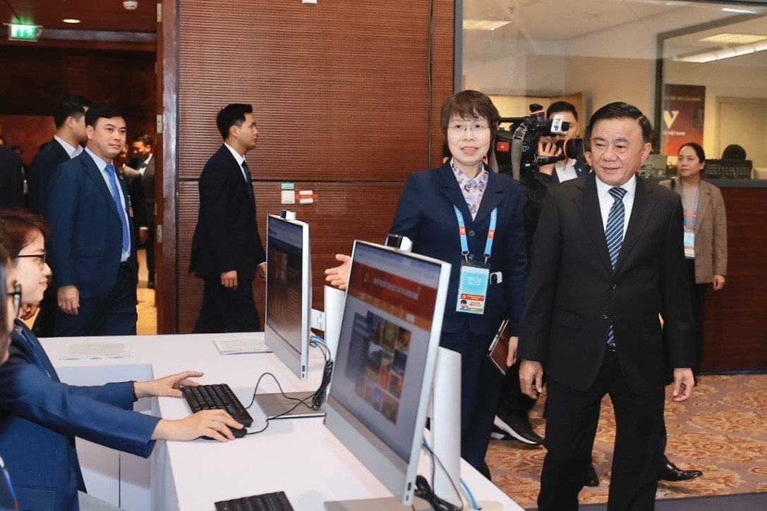 Thường trực Ban Bí thư Trần Cẩm Tú cùng các đại biểu thăm khu vực tác nghiệp của Thông tấn xã Việt Nam tại Trung tâm Báo chí. Ảnh: Phương Hoa - TTXVN
