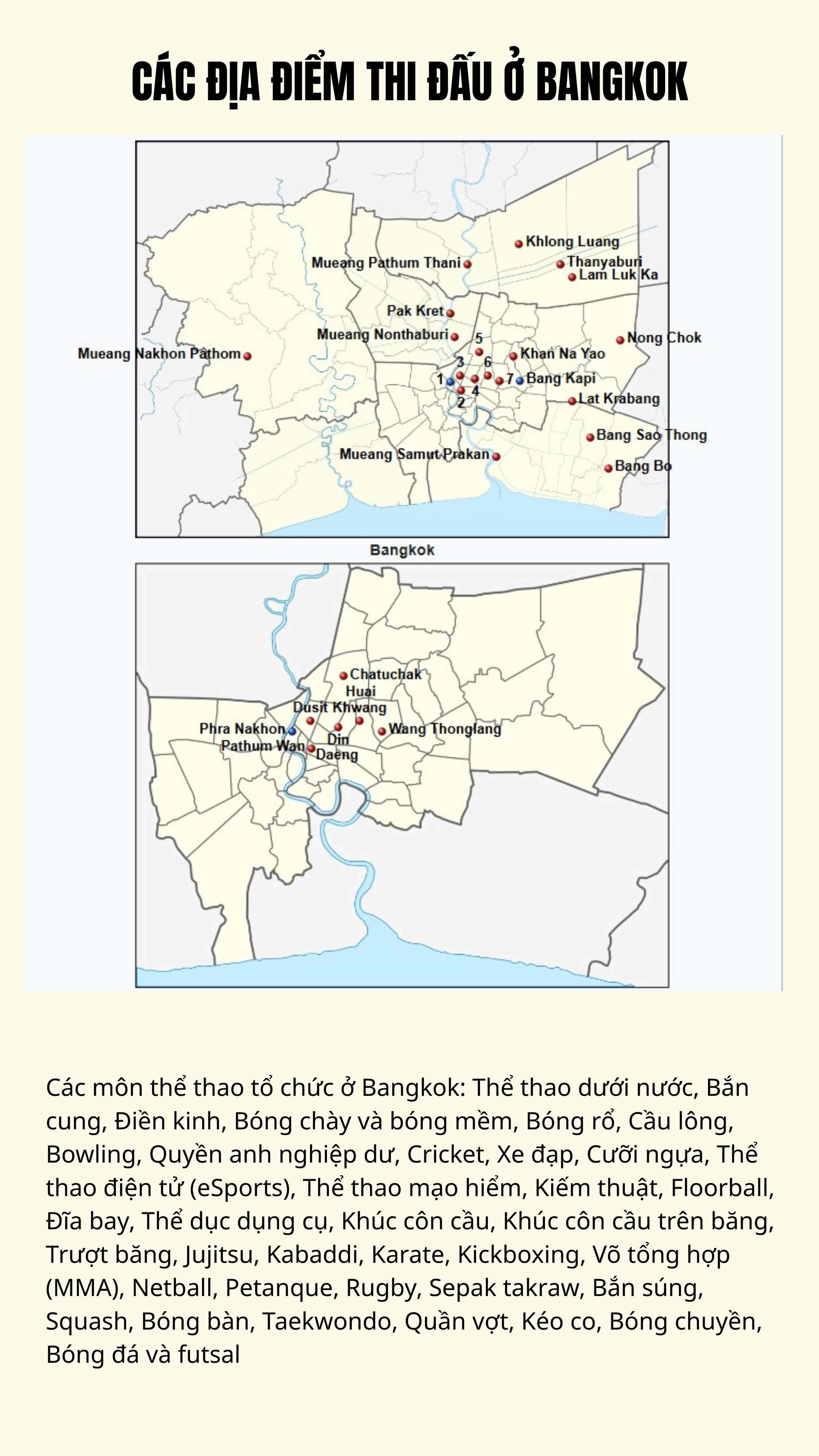 Bangkok sẽ tổ chức nhiều môn thể thao tại SEA Games 33, với các sự kiện chính diễn ra trong thành phố và mỗi địa điểm đều được chuẩn bị để phục vụ vận động viên và khán giả quốc tế từ khắp Đông Nam Á.