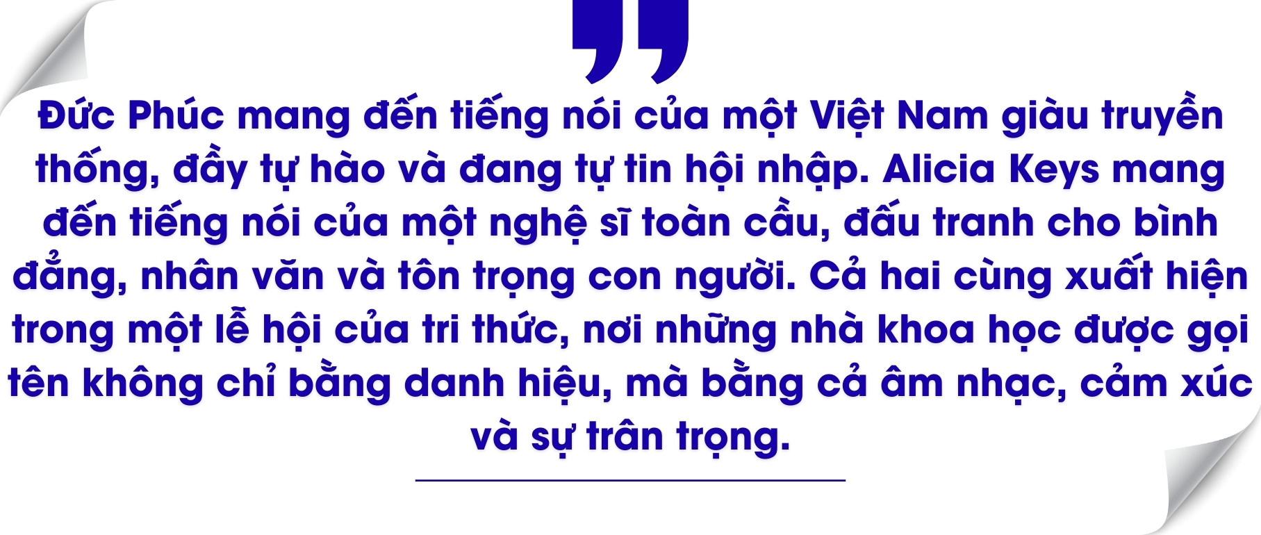 Tựu chung, nhìn vào sự xuất hiện song song của Đức Phúc và Alicia Keys trên cùng sân khấu VinFuture 2025, có thể thấy rất rõ dụng ý của ban tổ chức. Mỗi lựa chọn nghệ sĩ, mỗi tiết mục trong mỗi mùa giải VinFuture đều được cân nhắc kỹ lưỡng.