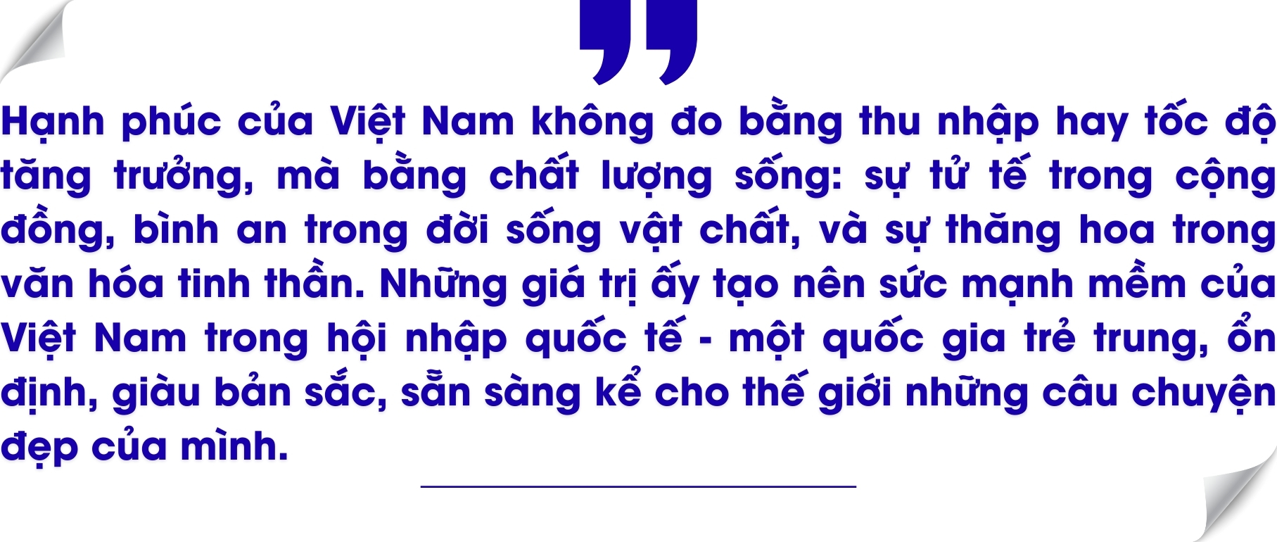 Nhìn sâu hơn, hạnh phúc của Việt Nam không đo bằng thu nhập hay tốc độ tăng trưởng, mà bằng chất lượng sống: sự tử tế trong cộng đồng, bình an trong đời sống vật chất, và sự thăng hoa trong văn hóa tinh thần. Những giá trị ấy tạo nên sức mạnh mềm của Việt Nam trong hội nhập quốc tế - một quốc gia trẻ trung, ổn định, giàu bản sắc, sẵn sàng kể cho thế giới những câu chuyện đẹp của mình.