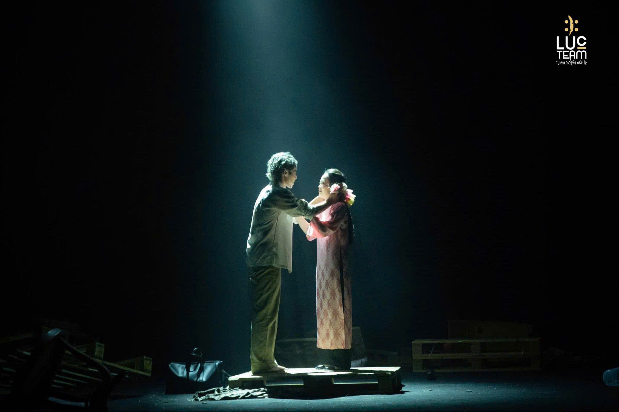 Ở góc độ khác, trong khi diễn xuất đi theo hướng tả thực, không gian sân khấu lại được thiết kế tối giản và tượng trưng. Một chiếc bục gỗ duy nhất giữa sân khấu - được ghép từ những tấm ván thô mộc - trở thành trung tâm biểu tượng. Nó là mái nhà, là dòng thời gian, là thế giới nội tâm của nhân vật, nơi những ước mơ và bi kịch cùng tồn tại.