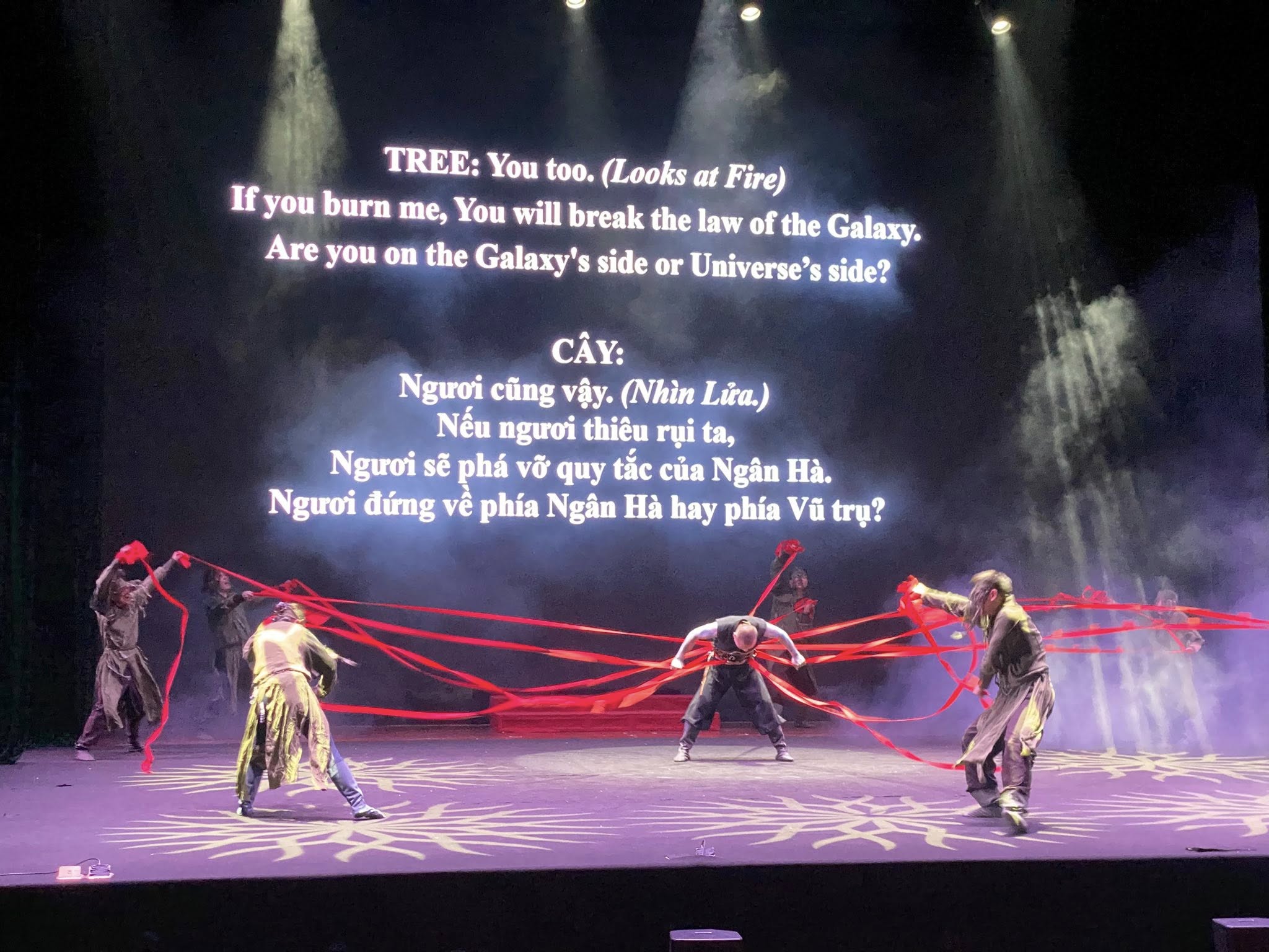 Cụ thể, với Vũ trụ, tác phẩm xây dựng hệ thống các thực thể mang tính biểu tượng như lửa, nước, cây, sắt, gió, bụi… Đây là hướng tiếp cận hiếm gặp trên sân khấu, khi kịch bản không đi theo tuyến nhân vật hoặc xung đột, mà mở ra một thế giới riêng, nơi mâu thuẫn bắt nguồn từ chính quy luật của tạo hóa. Và dù không trực tiếp nói về con người, câu hỏi mở ra lại liên quan vấn đề thời sự nóng nhất của nhân loại như biến đổi khí hậu, chiến tranh, cạn kiệt tài nguyên, ranh giới mong manh giữa kiến tạo và hủy diệt…