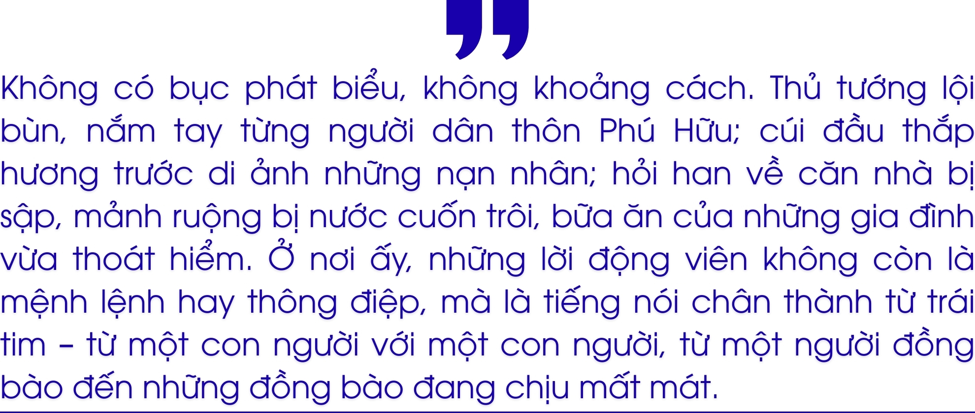 Không có bục phát biểu, không khoảng cách. Thủ tướng lội bùn, nắm tay từng người dân thôn Phú Hữu; cúi đầu thắp hương trước di ảnh những nạn nhân; hỏi han về căn nhà bị sập, mảnh ruộng bị nước cuốn trôi, bữa ăn của những gia đình vừa thoát hiểm. Ở nơi ấy, những lời động viên không còn là mệnh lệnh hay thông điệp, mà là tiếng nói chân thành từ trái tim – từ một con người với một con người, từ một người đồng bào đến những đồng bào đang chịu mất mát.