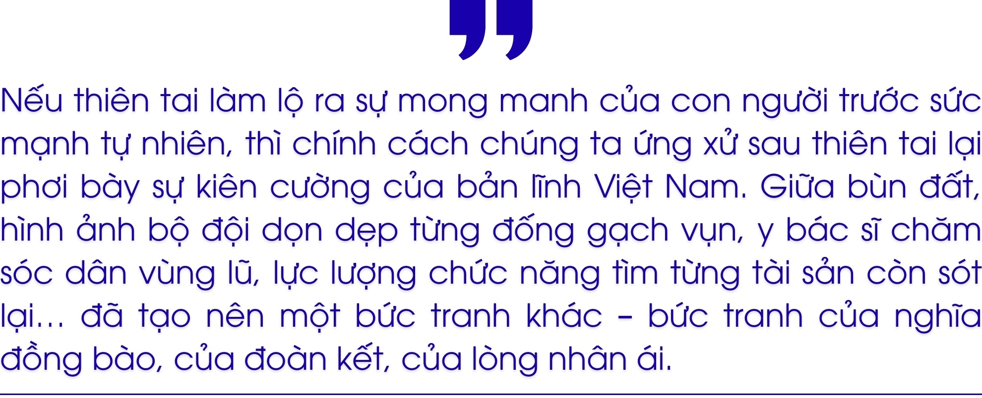 Trong khoảnh khắc đối diện thiên tai, người Việt lại tìm thấy sức mạnh từ nơi sâu thẳm nhất của văn hóa dân tộc: tình người. Chính sự sẻ chia ấy, chính văn hóa ấy, chính tình đồng bào ấy đã giúp dân tộc này đi qua bao bão giông của lịch sử.