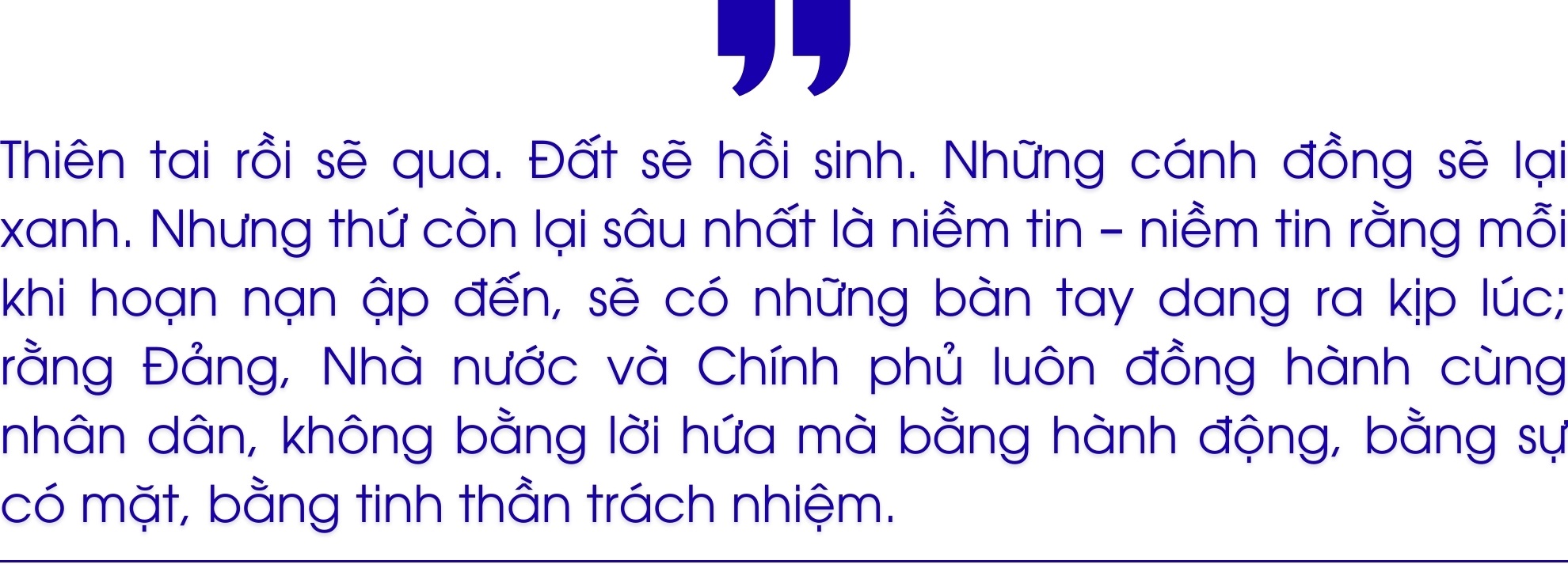 Sự xuất hiện ấy gửi đi một thông điệp giản dị nhưng mạnh mẽ: nhân dân gặp nạn ở đâu, lãnh đạo phải có mặt ở đó. Không phải chỉ để chứng kiến, mà để nâng đỡ tinh thần, thắp lên hy vọng và trao thêm nghị lực cho những người đang đứng giữa hoang tàn.