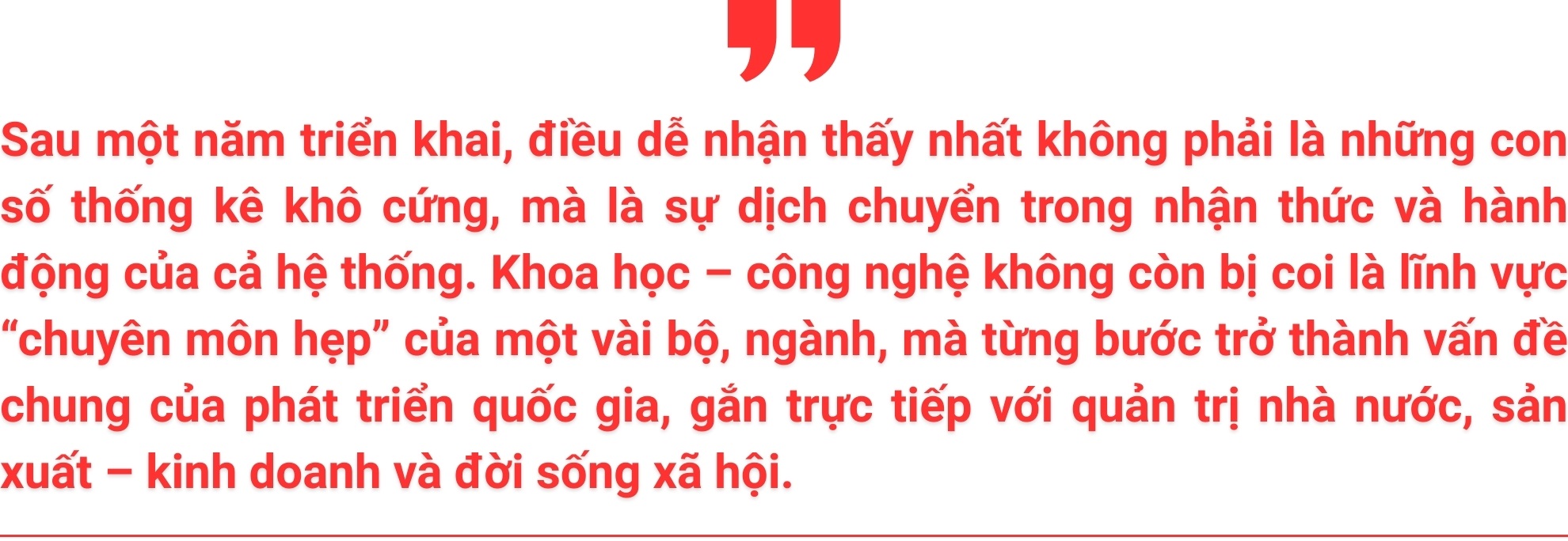 Sau một năm triển khai, điều dễ nhận thấy nhất không phải là những con số thống kê khô cứng, mà là sự dịch chuyển trong nhận thức và hành động của cả hệ thống. Khoa học - công nghệ không còn bị coi là lĩnh vực "chuyên môn hẹp" của một vài bộ, ngành, mà từng bước trở thành vấn đề chung của phát triển quốc gia, gắn trực tiếp với quản trị nhà nước, sản xuất - kinh doanh và đời sống xã hội.
